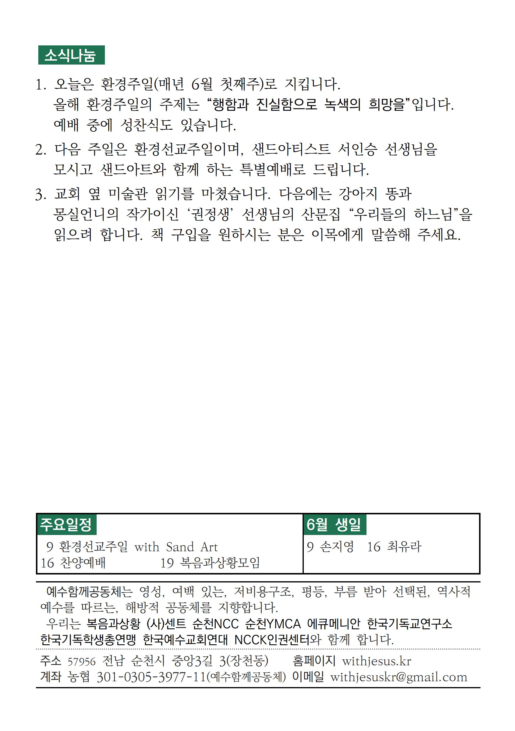 | [주보] 2024년 6월 9일 예수함께공동체 (0) | 2024.06.08 |