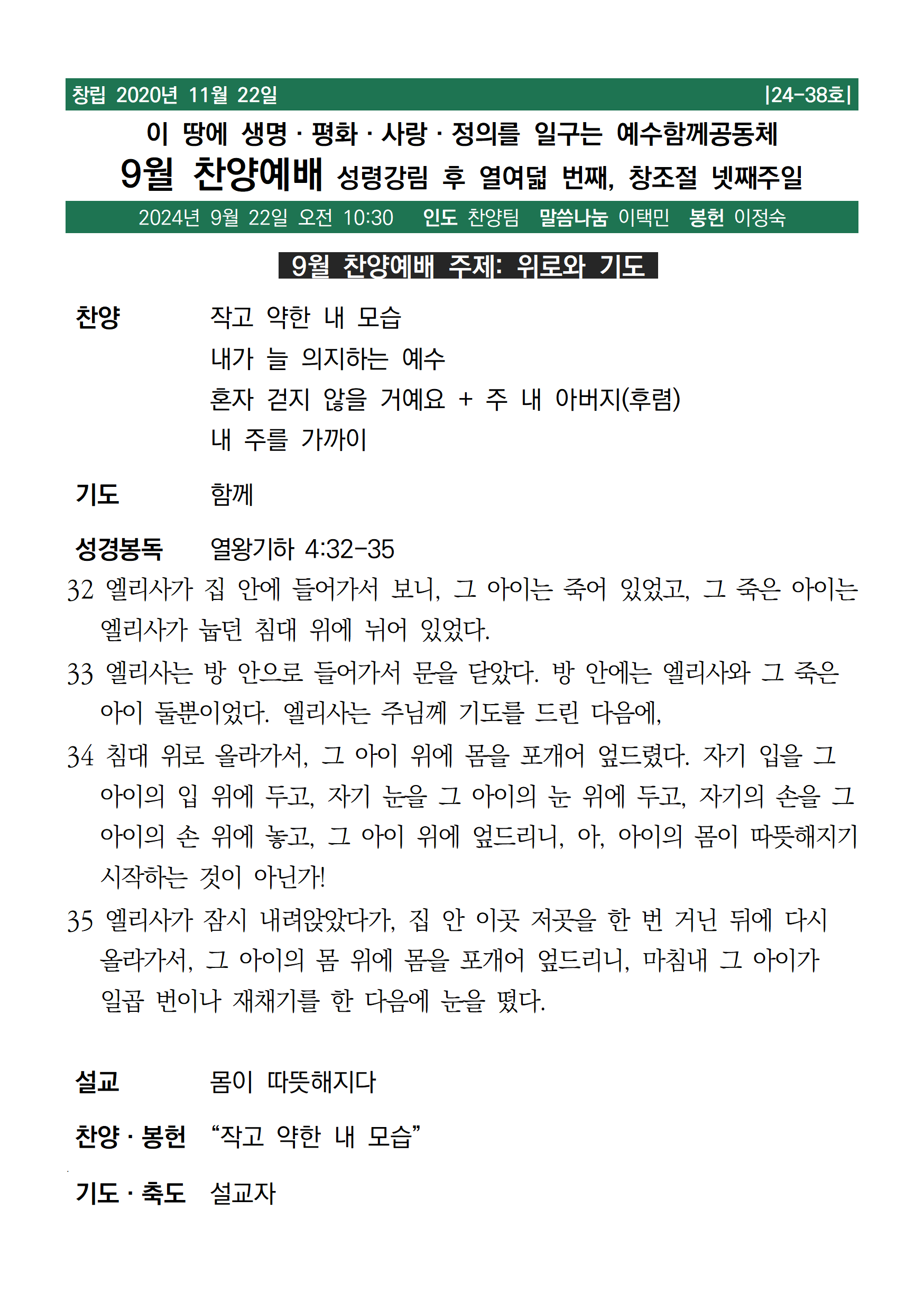 | [주보, 악보] 2024년 9월 29일 예수함께공동체 (0) | 2024.09.28 |