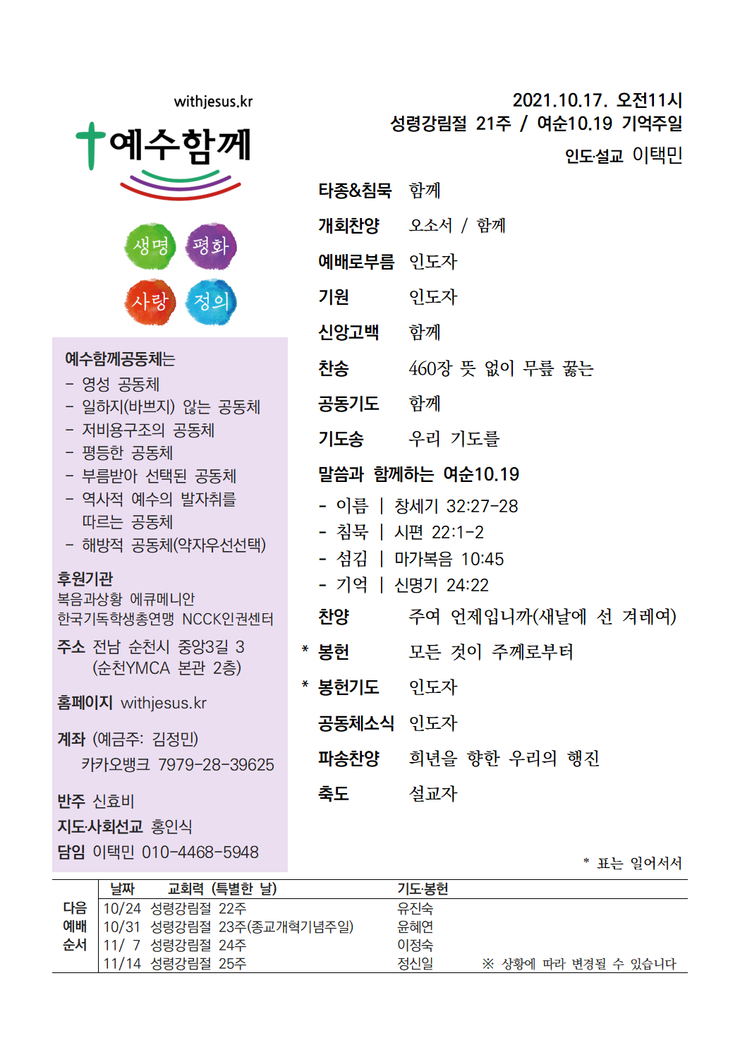 | 2021년 10월 10일 예수함께 주일예배 자료 (0) | 2021.10.10 |