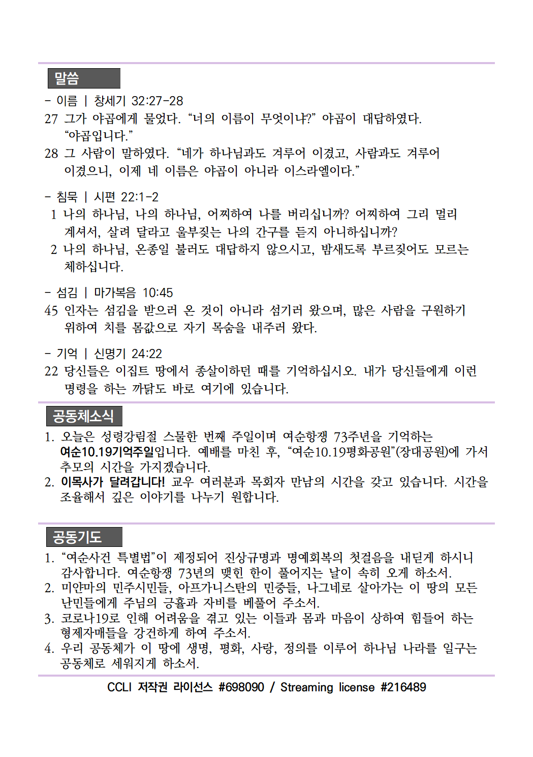 이번 예배는 여순10.19를 기억하는 주일예배로 드립니다.