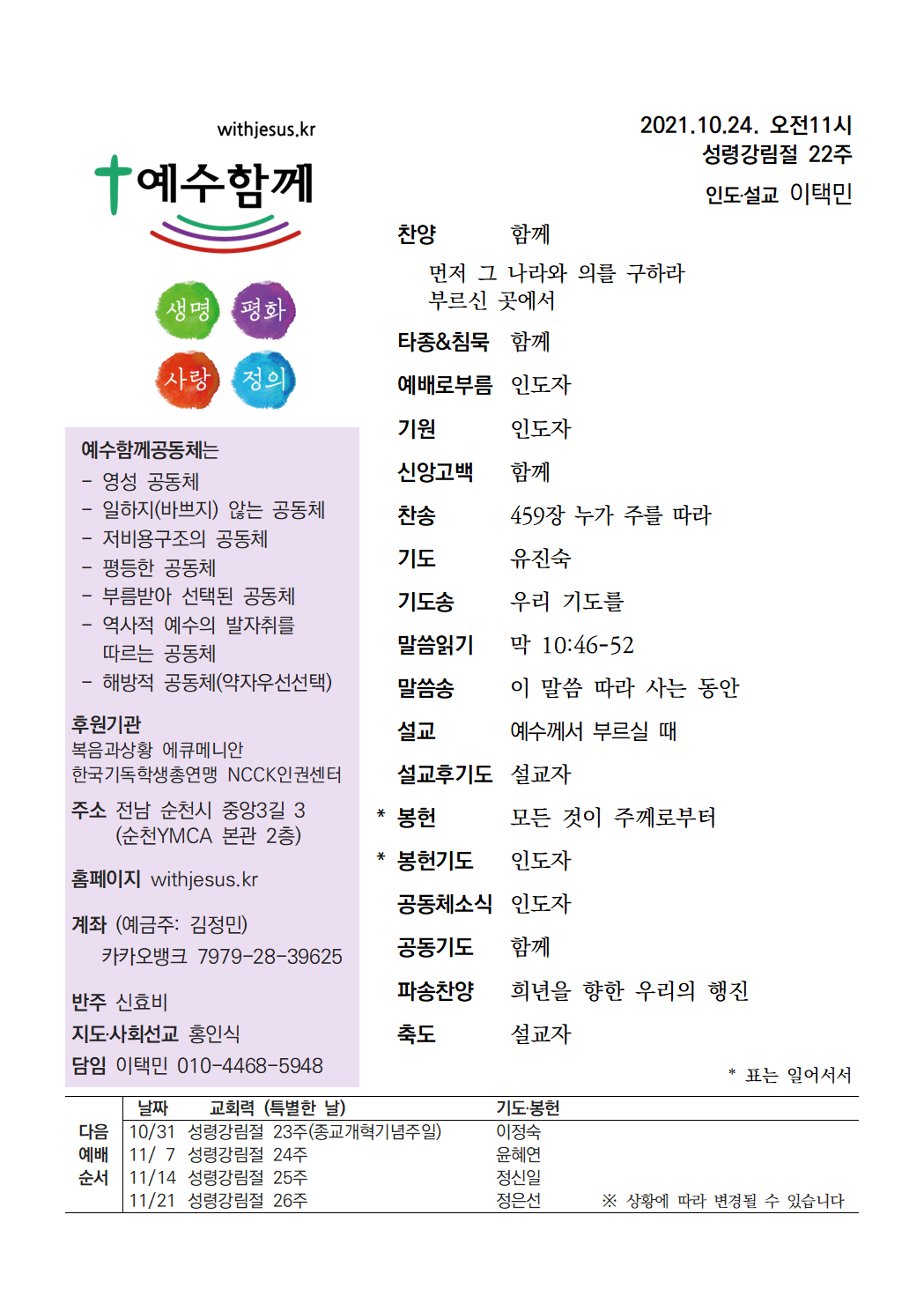 | 2021년 10월 17일 예수함께 주일예배 실황(여순10.19 기억예배) (0) | 2021.10.16 |