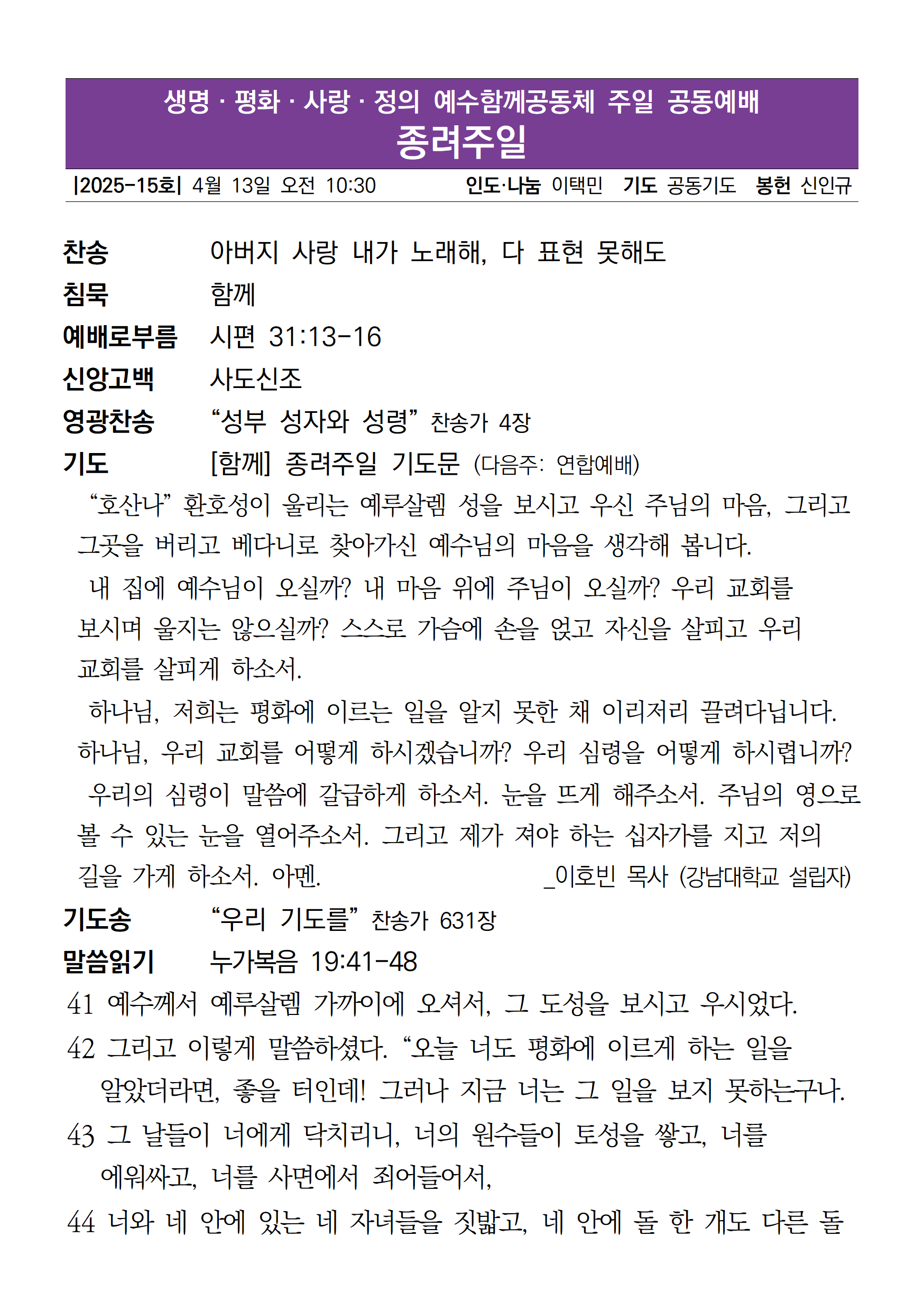 | [주일 공동예배] 2025년 4월 13일 예수함께공동체 (0) | 2025.04.12 |