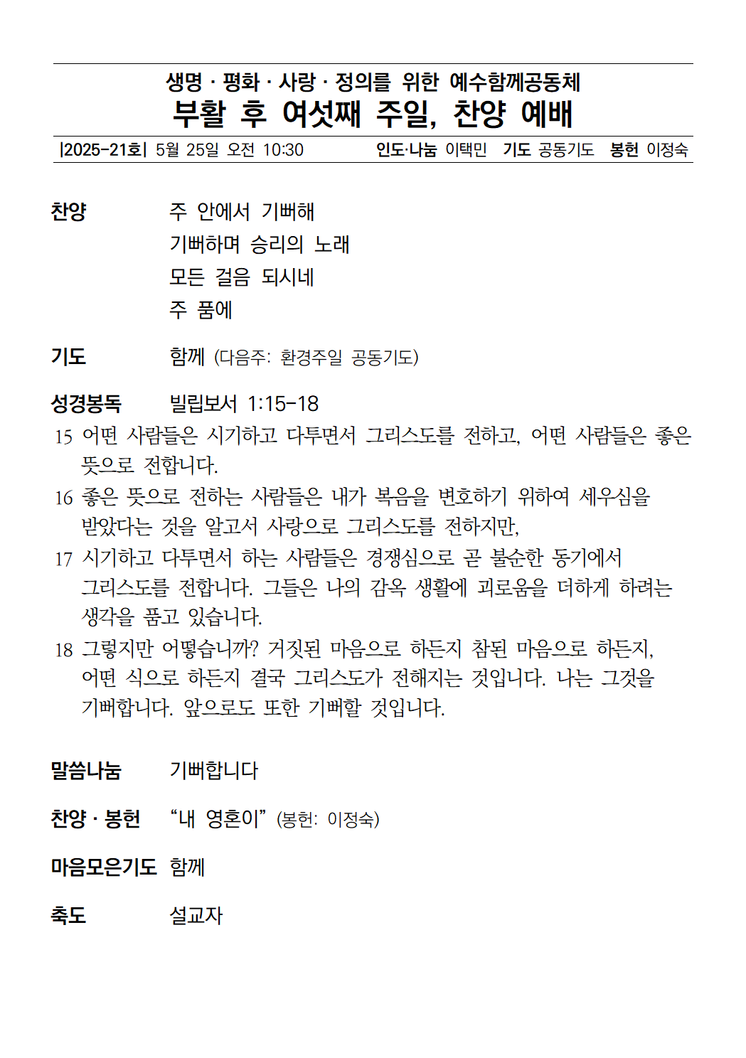| [주일 공동예배] 2025년 5월 25일 예수함께공동체 (0) | 2025.05.24 |