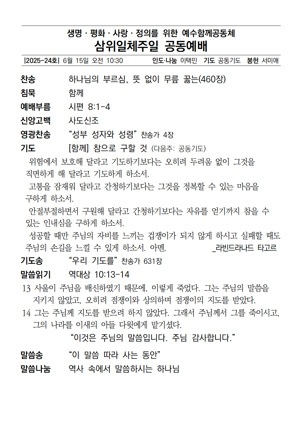 | [주일공동예배] 2025년 6월 15일 예수함께공동체 (0) | 2025.06.14 |