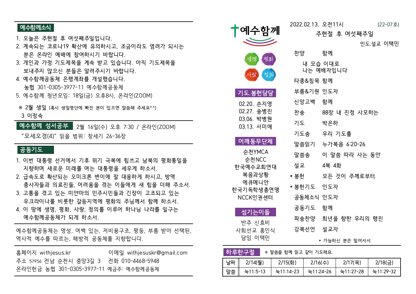 | 2022년 2월 6일 예수함께 주일예배 자료 (0) | 2022.02.05 |
