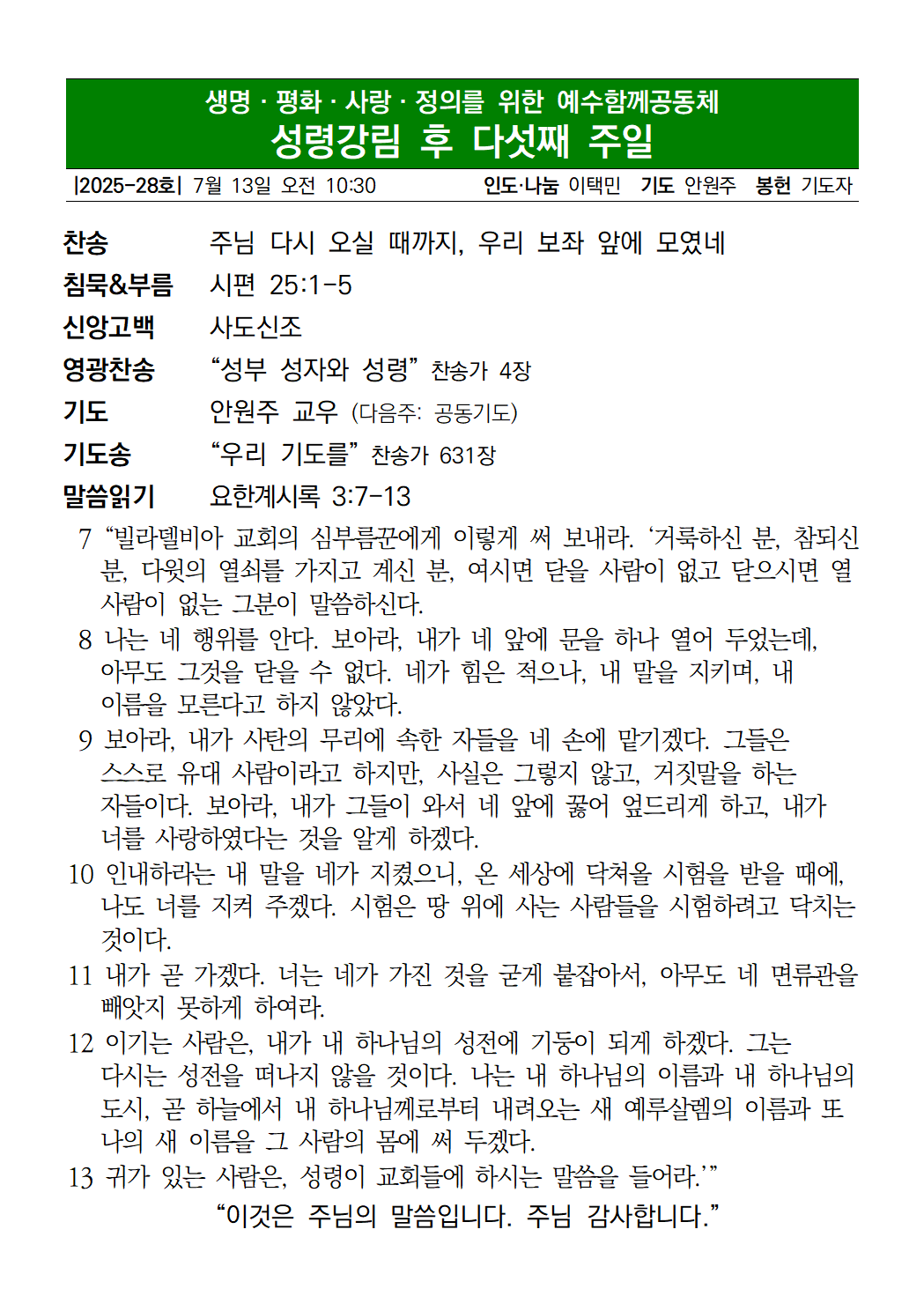 | [주보] 2025년 7월 6일 예수함께공동체 (0) | 2025.07.05 |