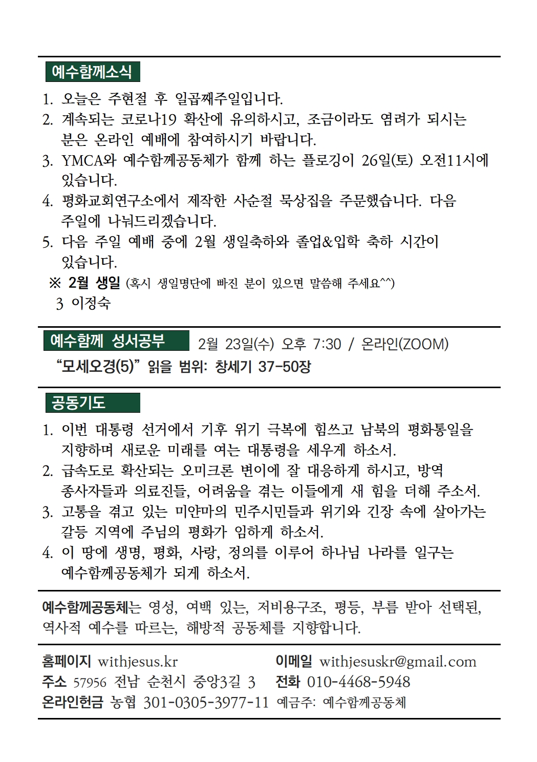 | 2022년 2월 20일 예수함께 주일예배 (0) | 2022.02.19 |
