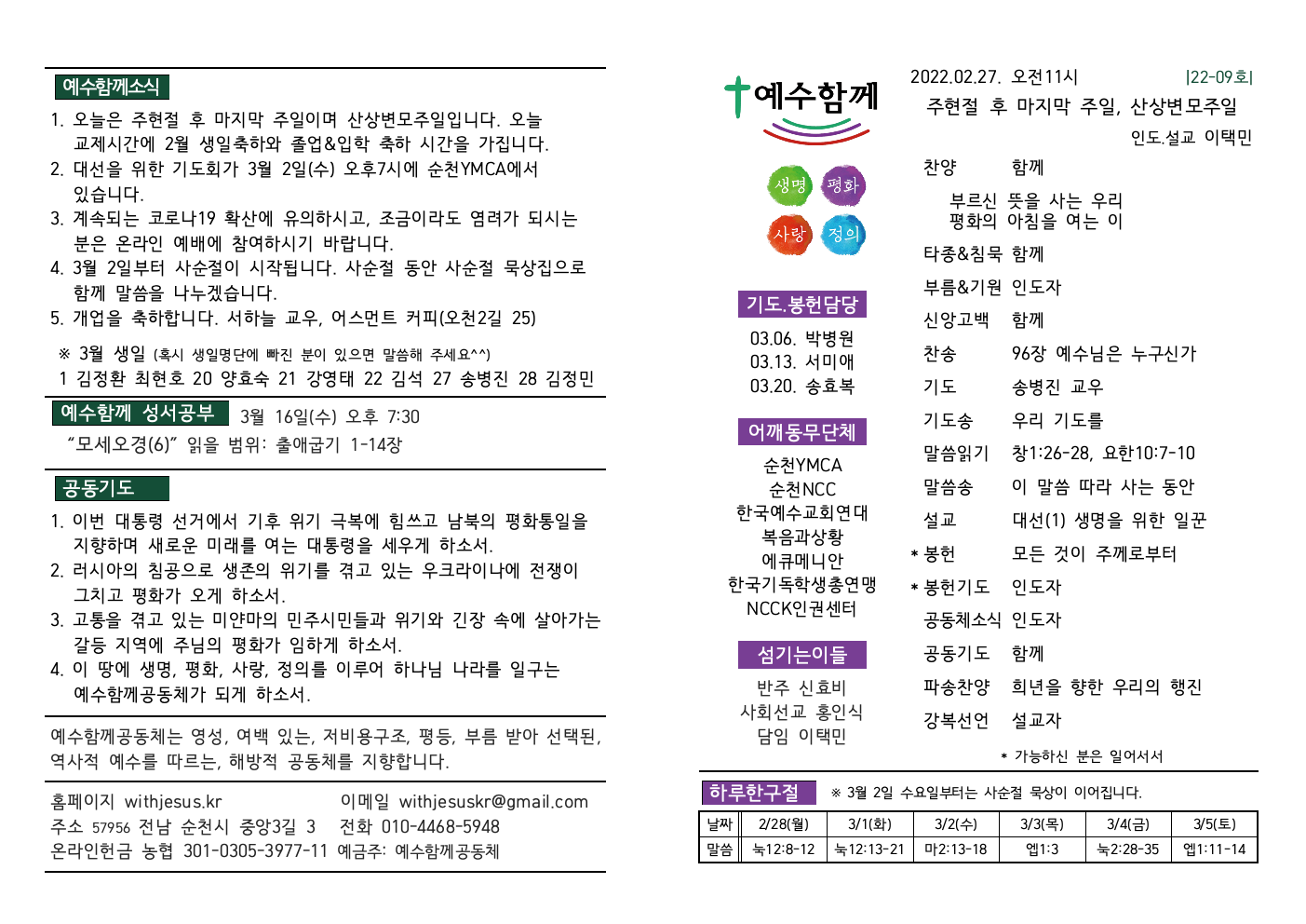 | 2022년 2월 27일 예수함께 주일예배 자료 (0) | 2022.02.26 |