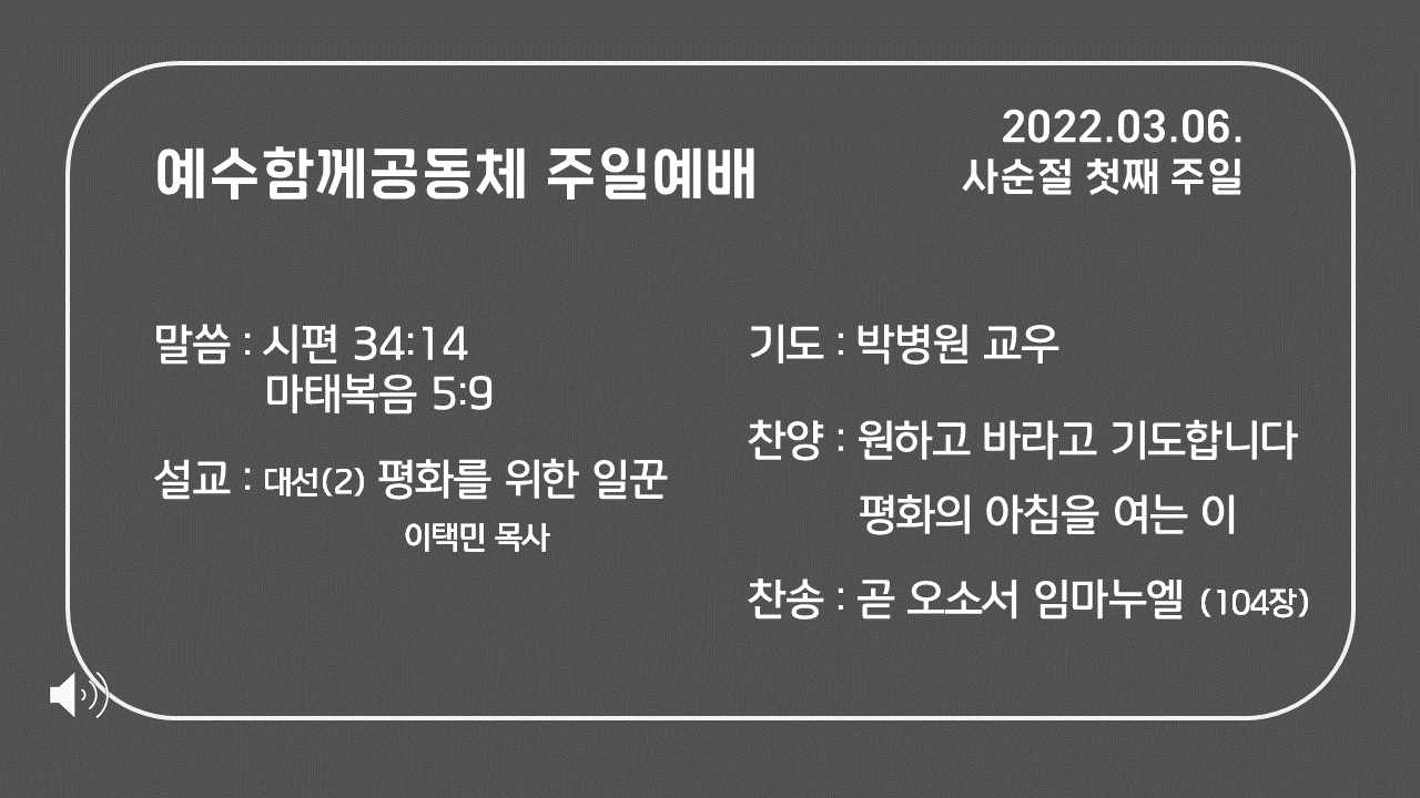 | 2022년 3월 13일 예수함께 주일예배 자료 (0) | 2022.03.12 |