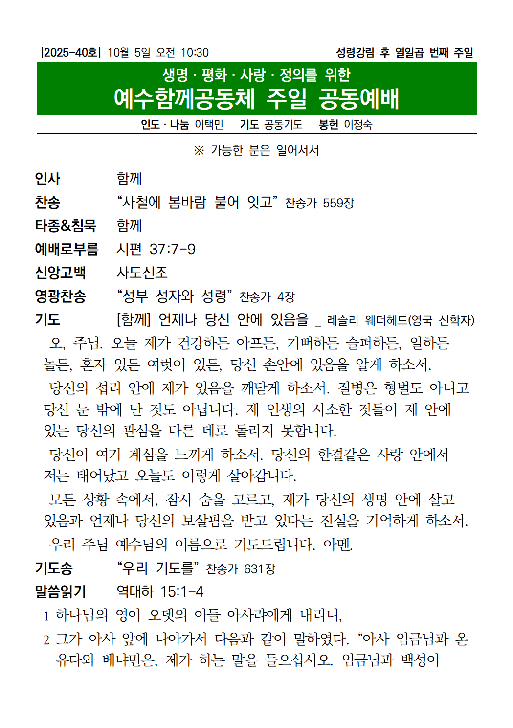 [주보] 2025년 10월 5일 예수함께공동체 주일공동예배