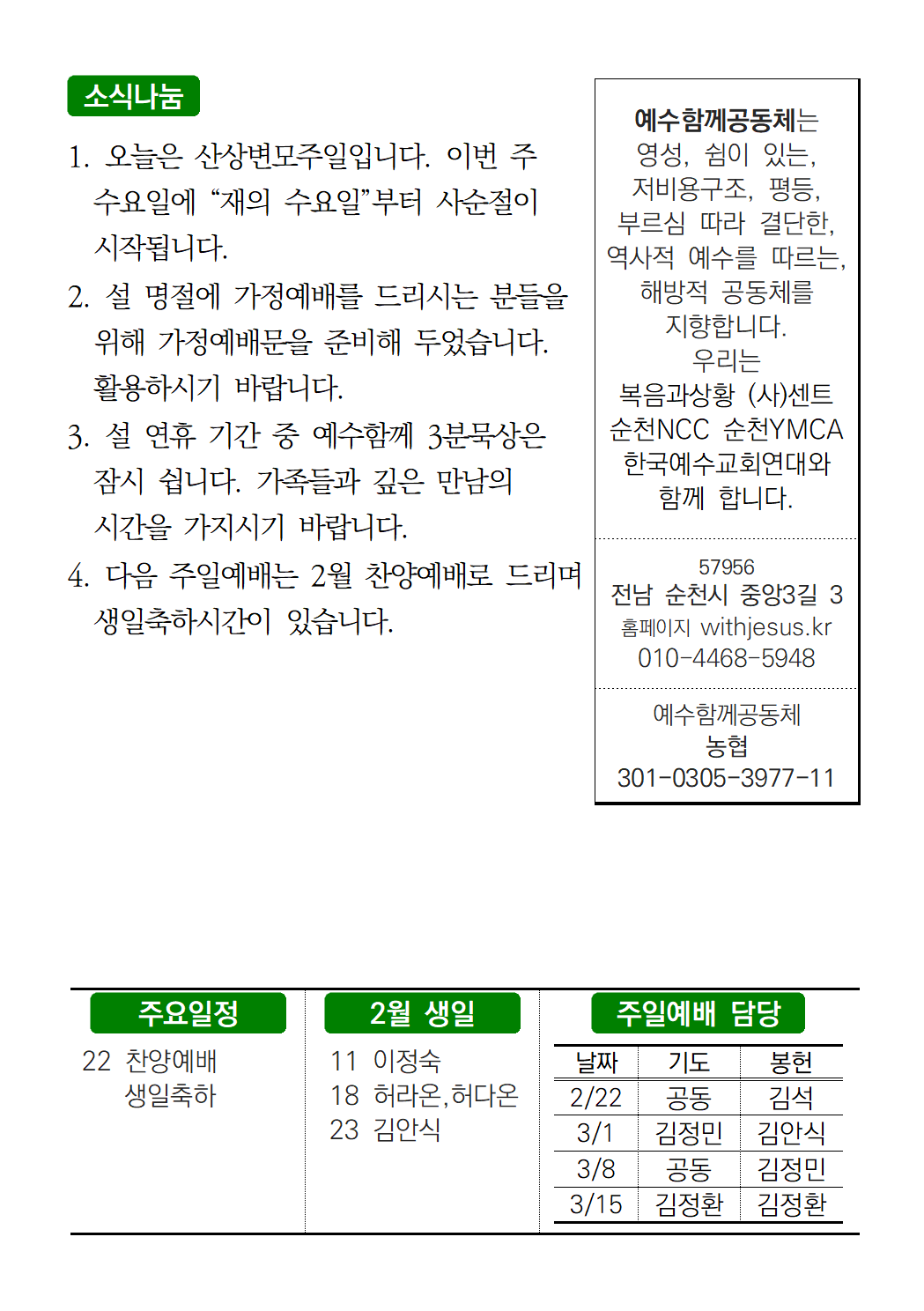 | [주보, 악보] 2026년 2월 22일 예수함께공동체 (0) | 2026.02.21 |