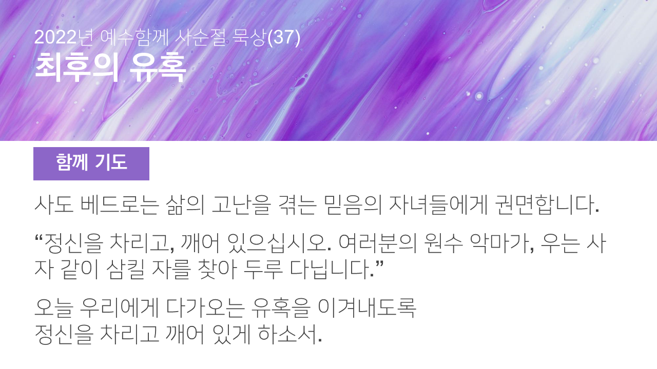 | [2022 예수함께 사순절 묵상] 38일차 _ 4월 14일(목) (0) | 2022.04.16 |