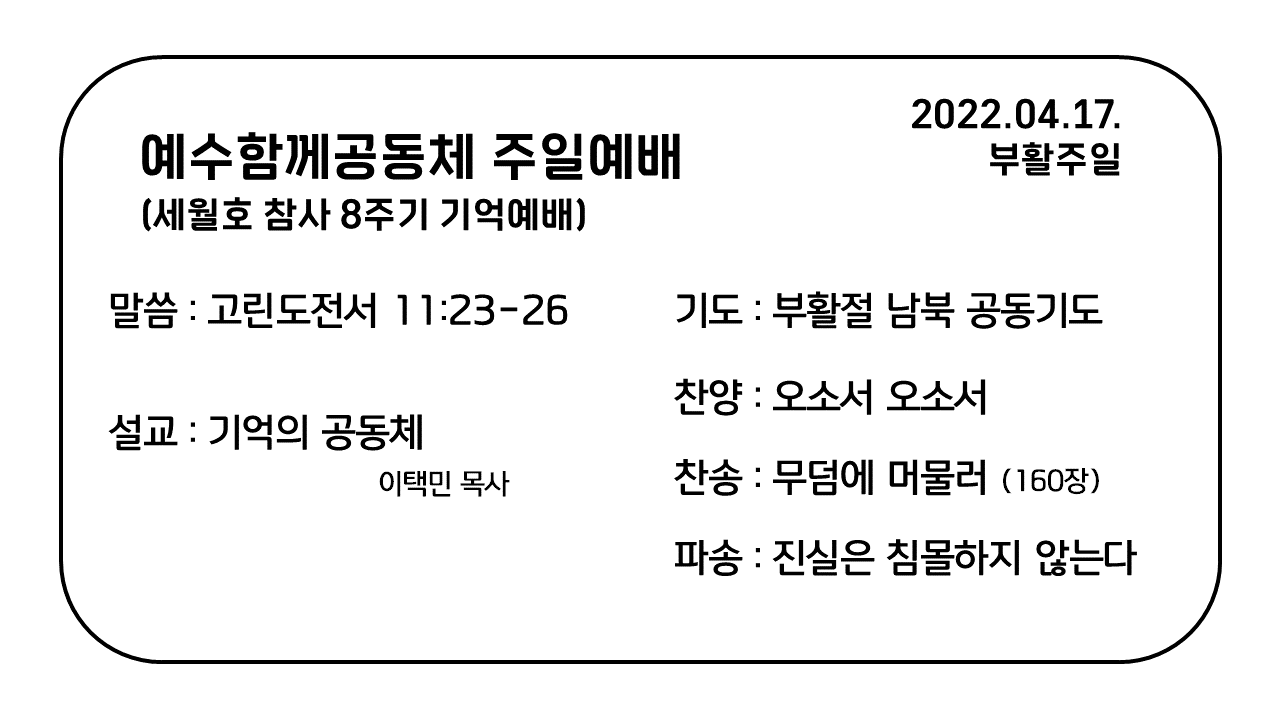 | 2022년 4월 17일 예수함께 주일예배 자료 (0) | 2022.04.16 |
