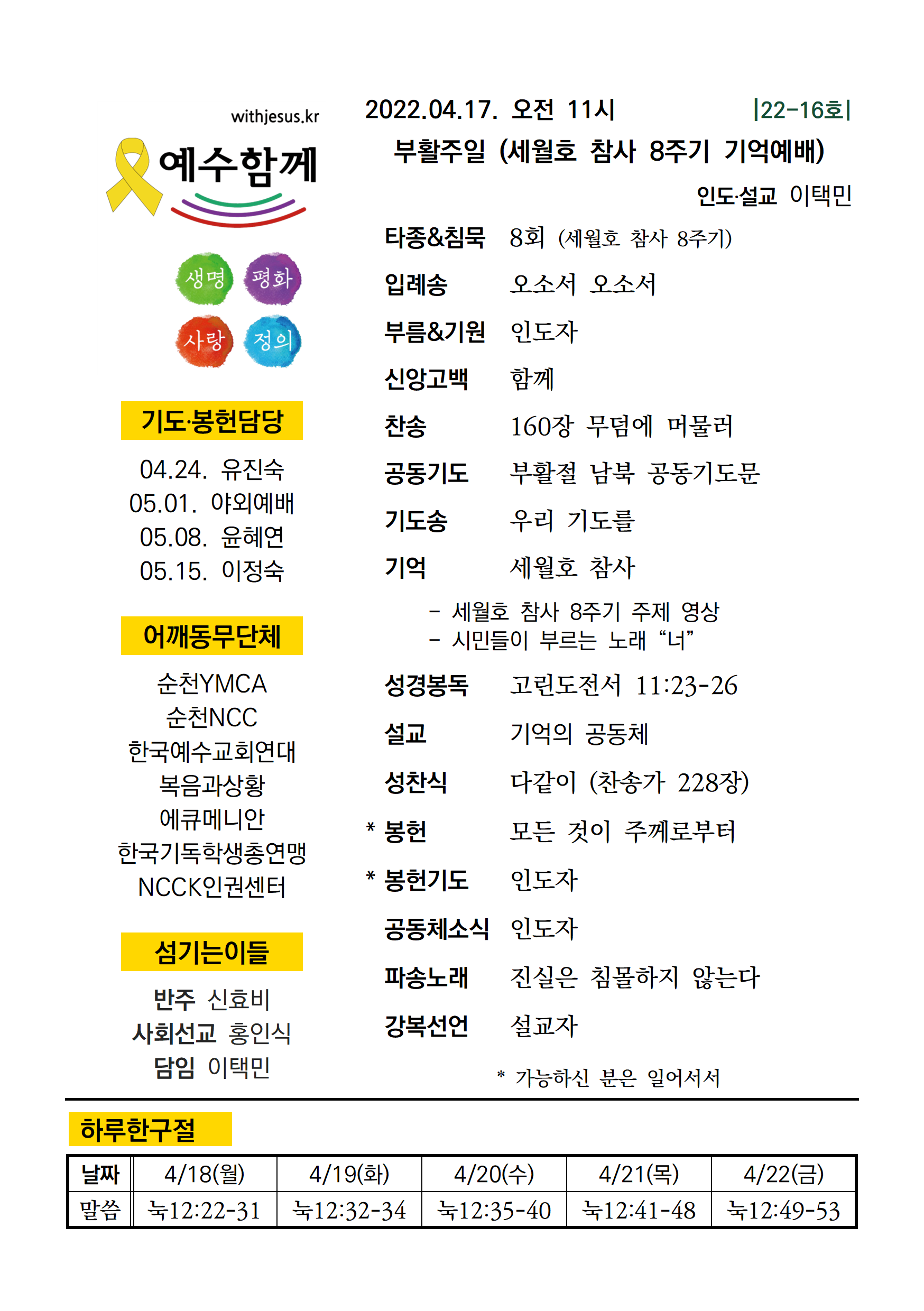| 2022년 4월 24일 예수함께 주일예배 자료 (0) | 2022.04.23 |