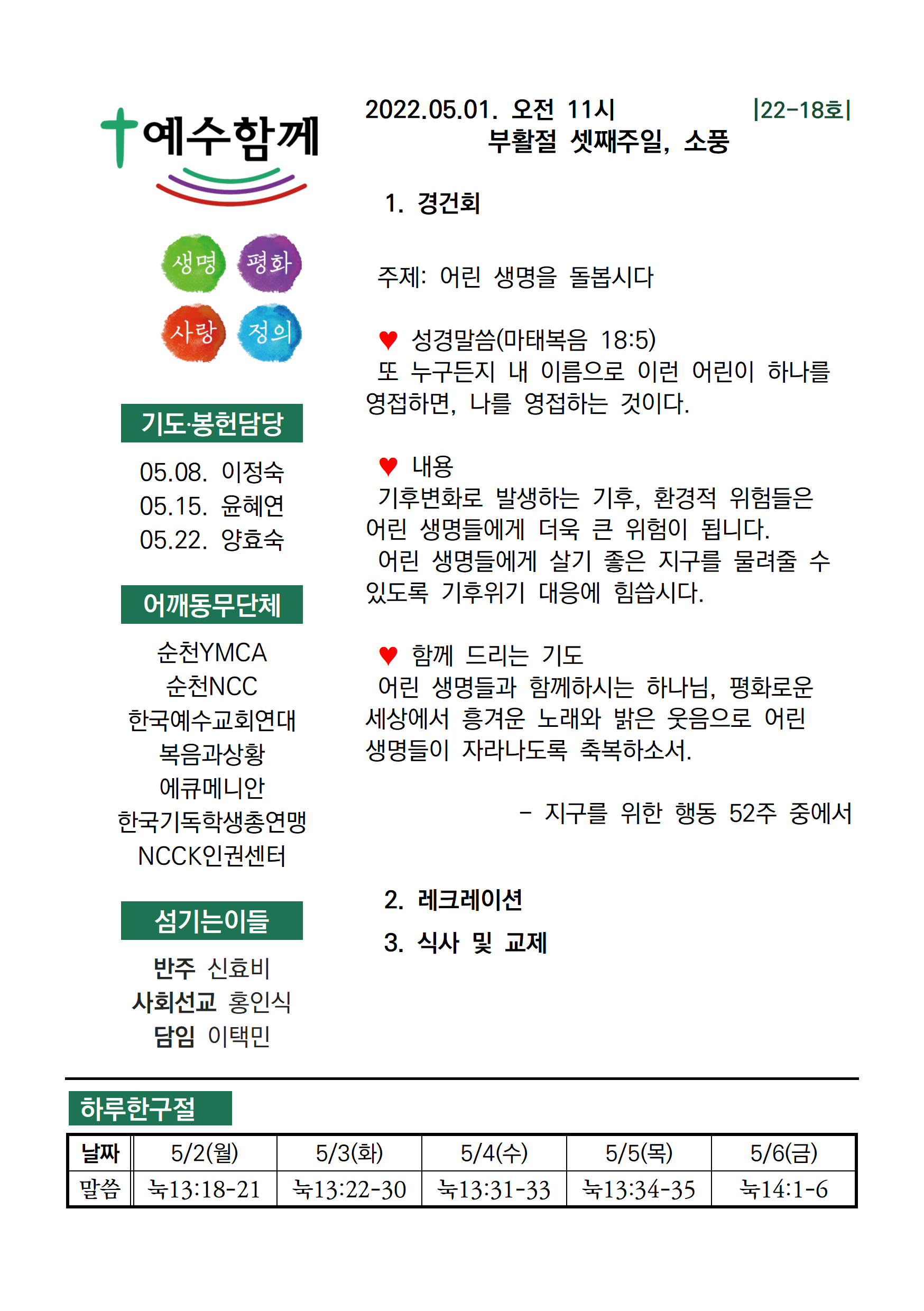 | 2022년 4월 24일 예수함께 주일예배 자료 (0) | 2022.04.23 |