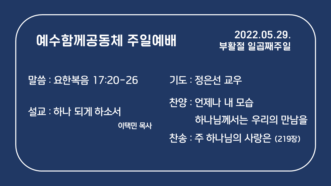 | 2022년 5월 22일 예수함께 주일예배 자료 (0) | 2022.05.21 |