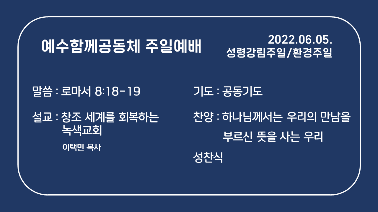 | 2022년 6월 12일 예수함께 주일예배 (0) | 2022.06.11 |