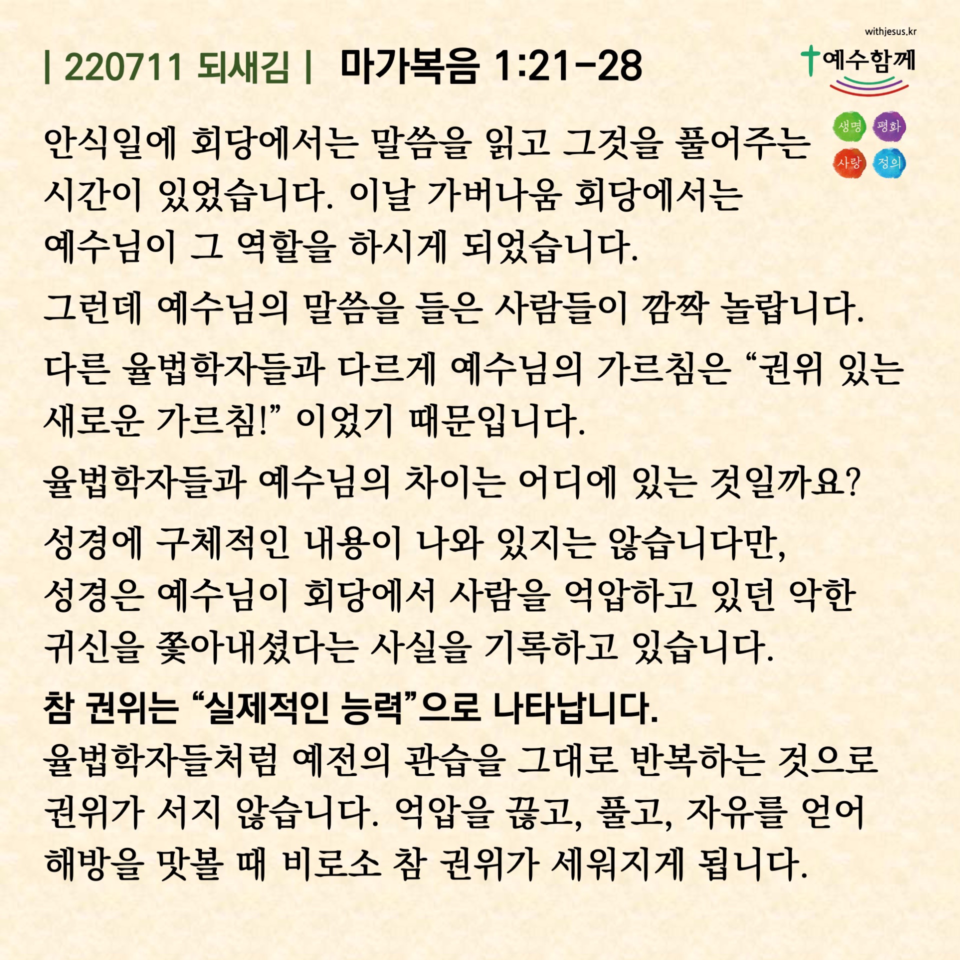 | [예수함께말씀 220712] 마가복음 1:29-31 (0) | 2022.07.11 |