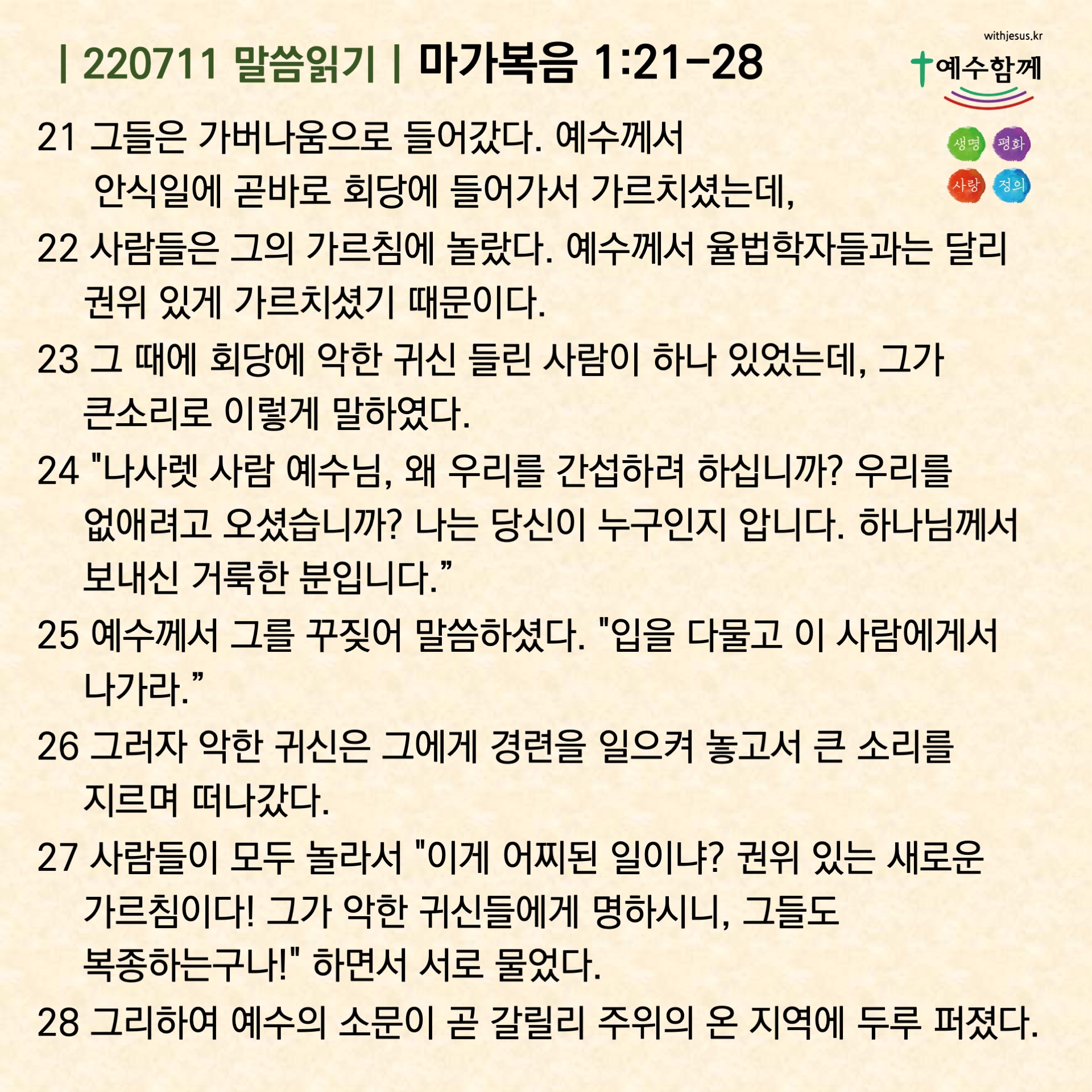 | [예수함께말씀 220712] 마가복음 1:29-31 (0) | 2022.07.11 |