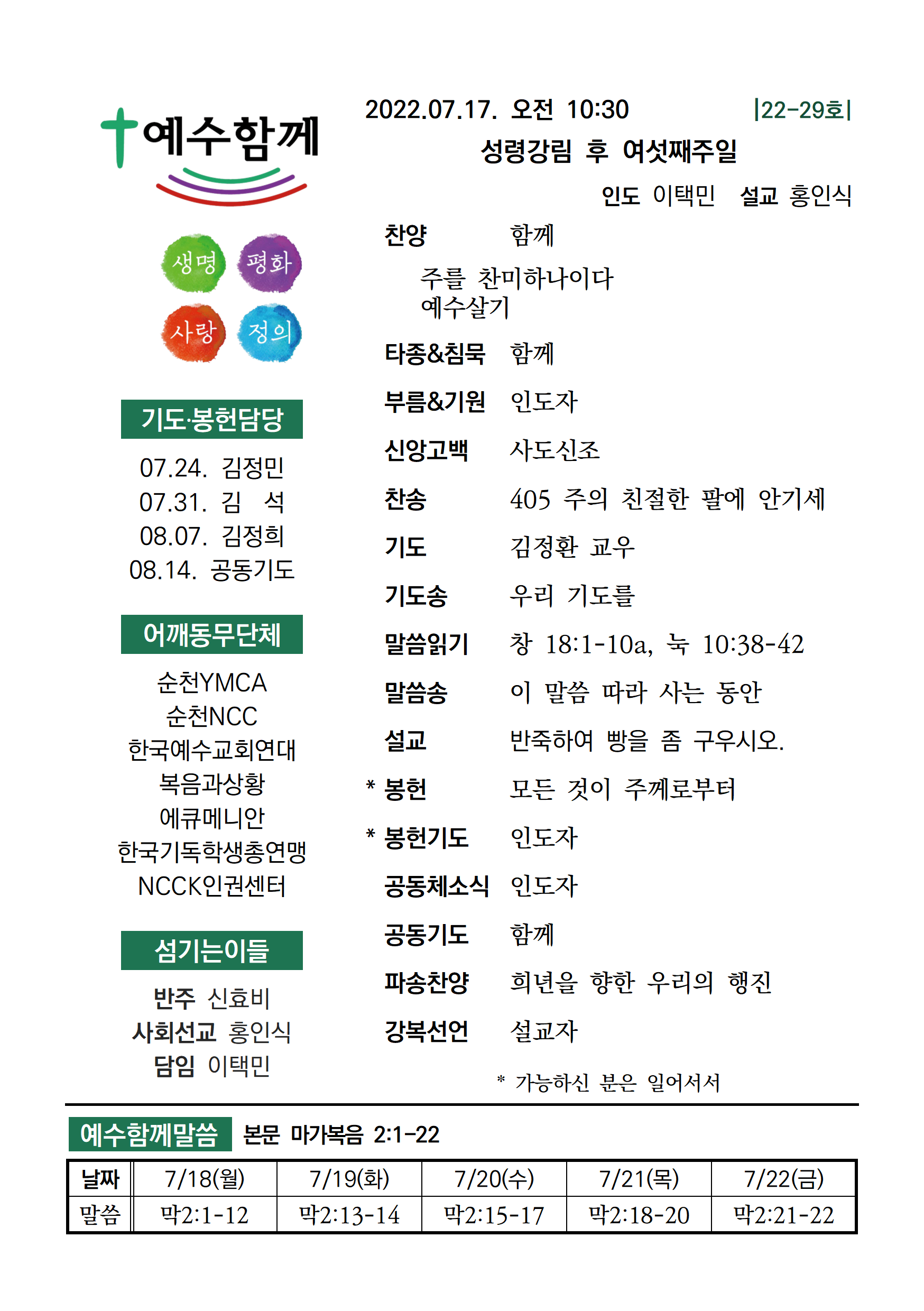 | 2022년 7월 24일 예수함께 주일예배 자료 (0) | 2022.07.23 |