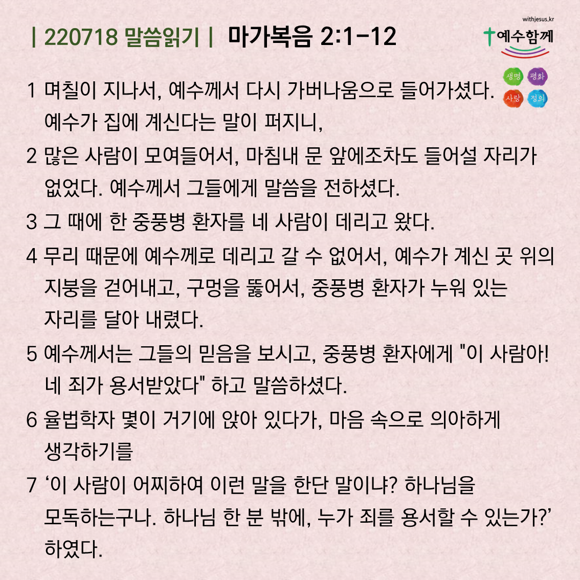 | [예수함께말씀 220719] 마가복음 2:13-14 (0) | 2022.07.18 |