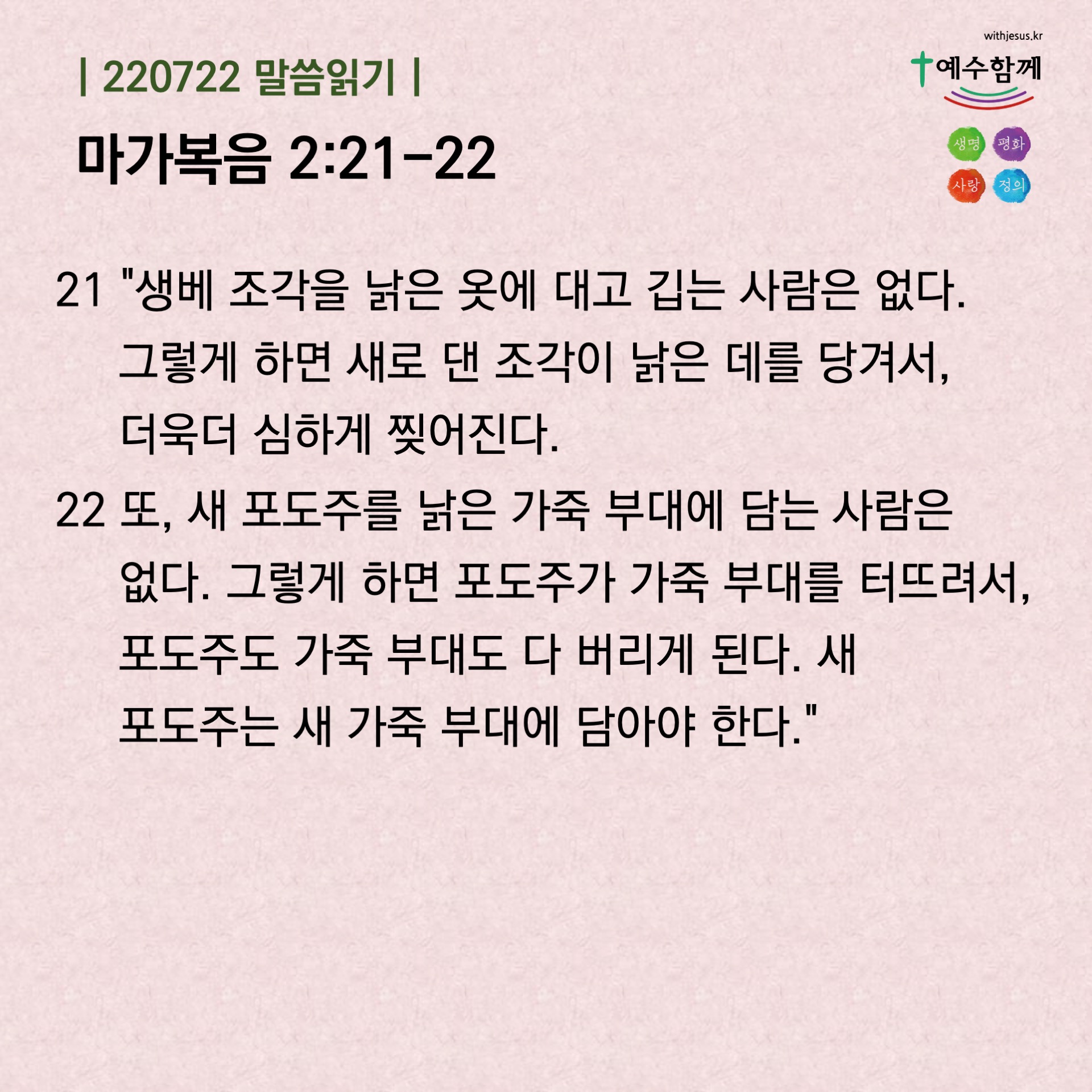 | [예수함께말씀 220721] 마가복음 2:18-20 (0) | 2022.07.21 |