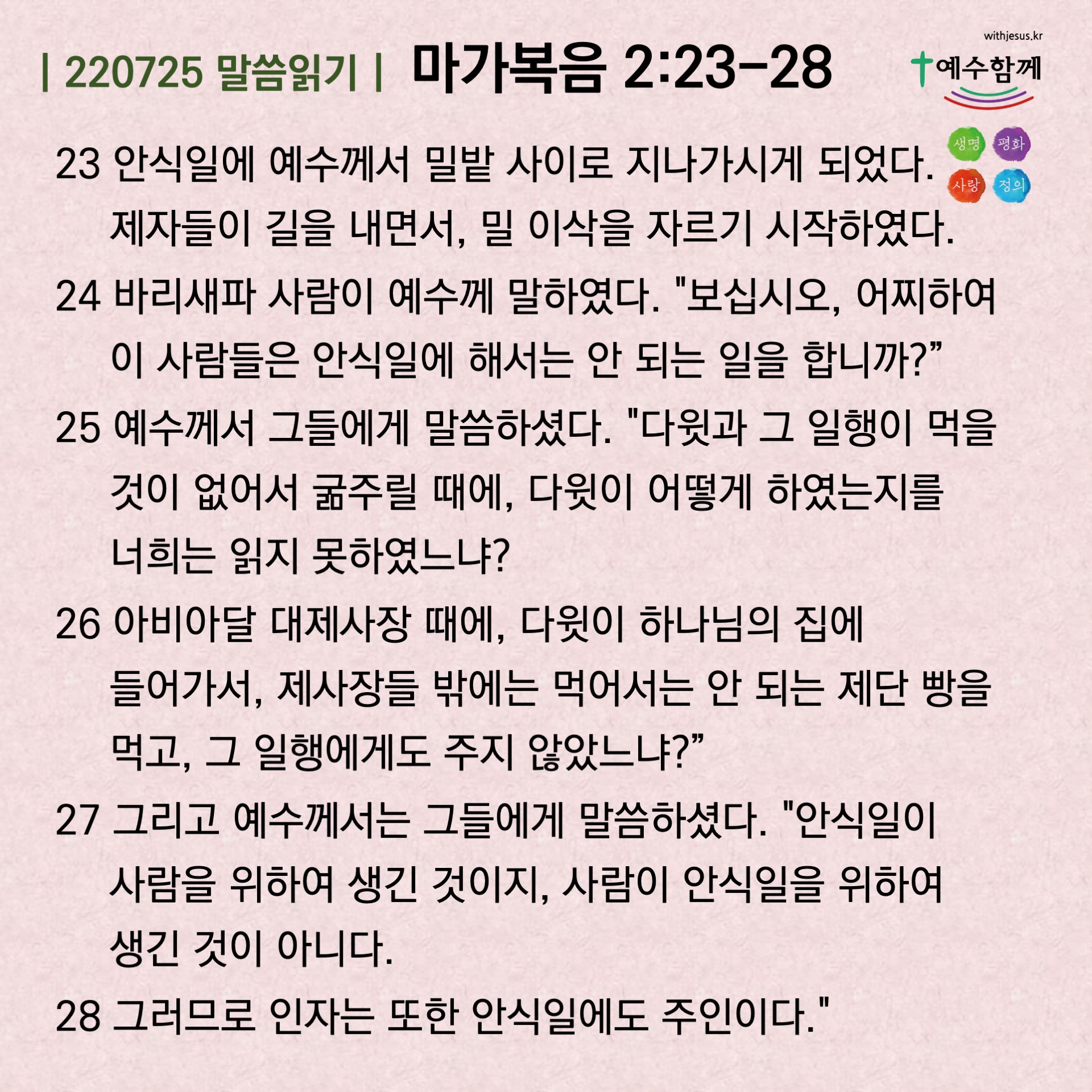 | [예수함께말씀 220726] 마가복음 3:1-6 (0) | 2022.07.26 |