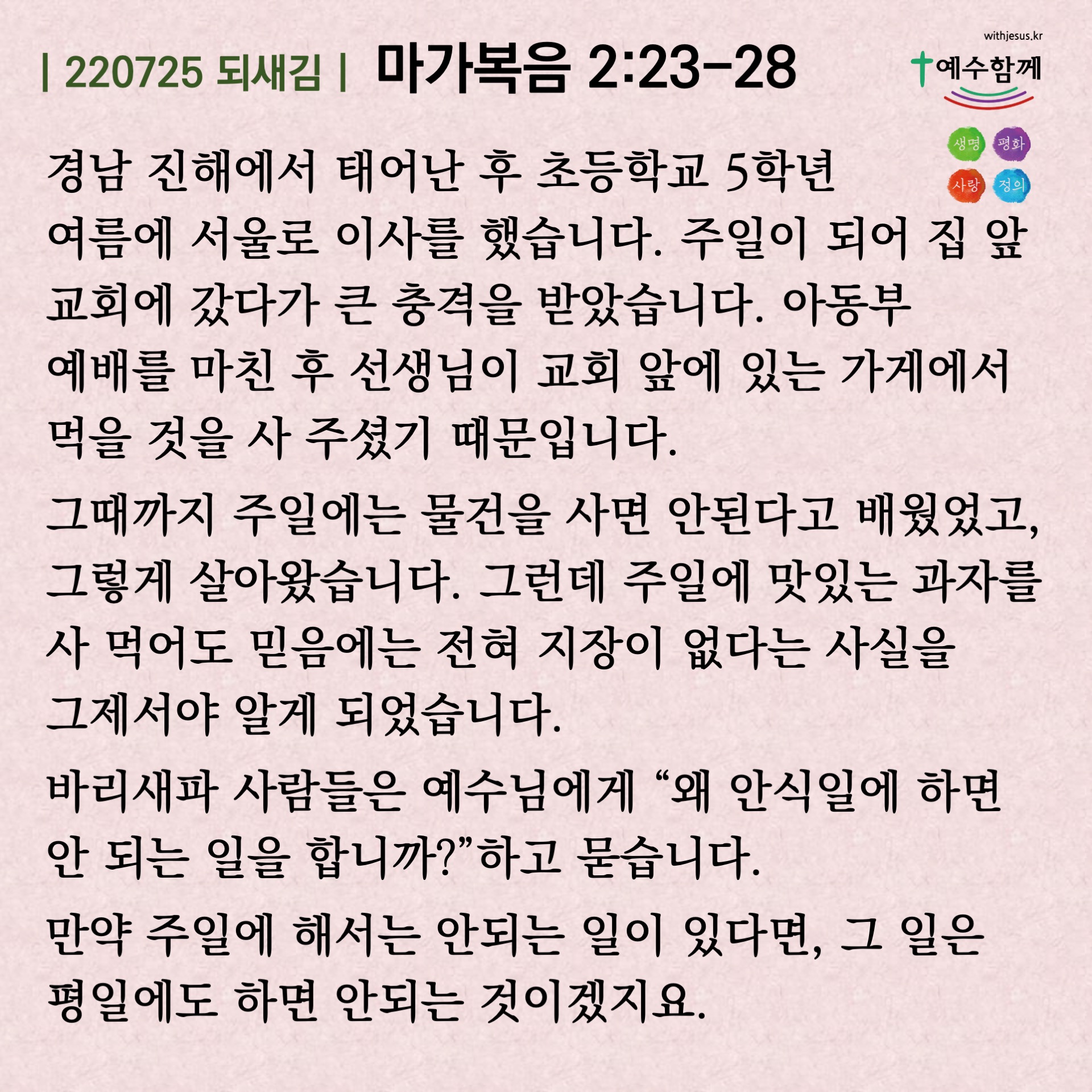 | [예수함께말씀 220726] 마가복음 3:1-6 (0) | 2022.07.26 |