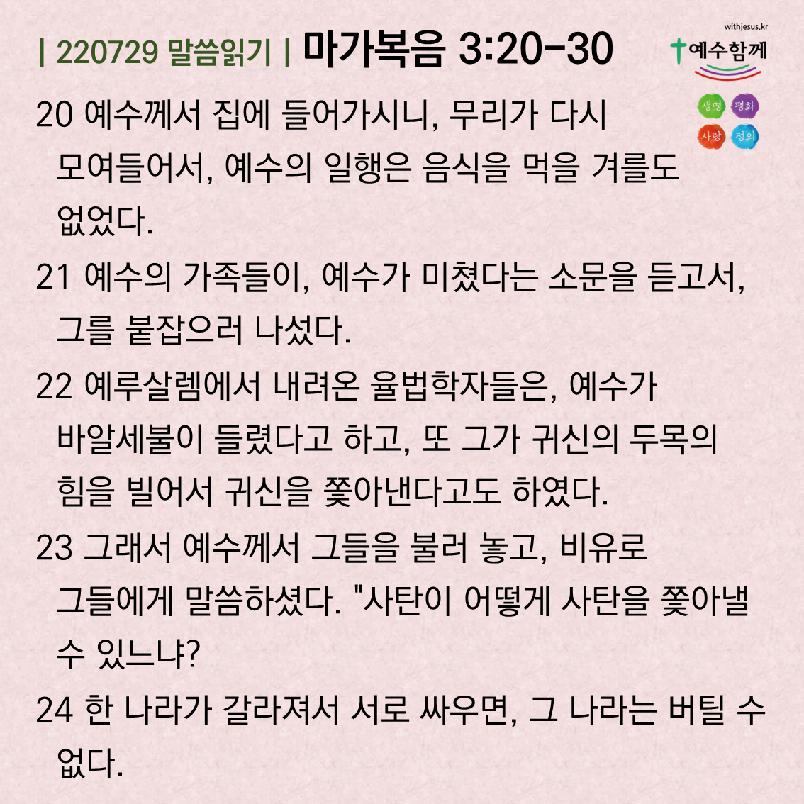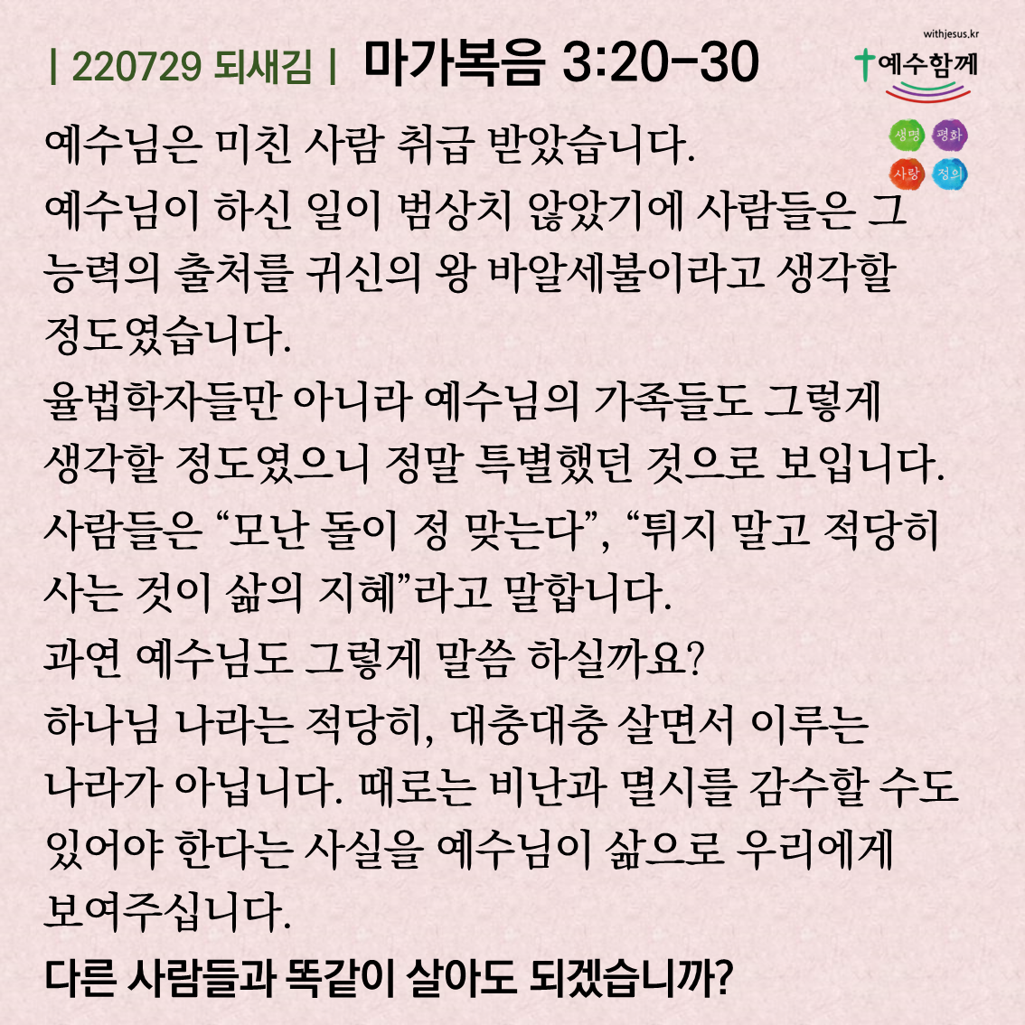 | [예수함께말씀 220727] 마가복음 3:7-12 (0) | 2022.07.26 |