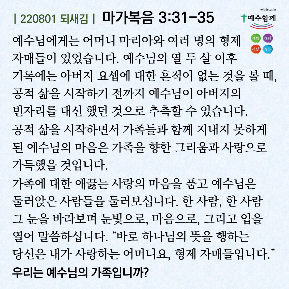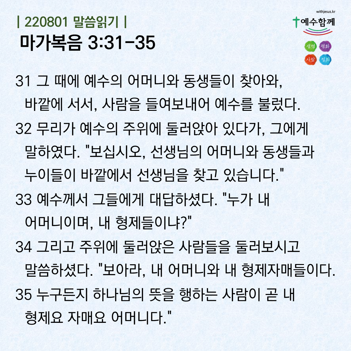 [예수함께말씀 220801] 마가복음 3:31-35
