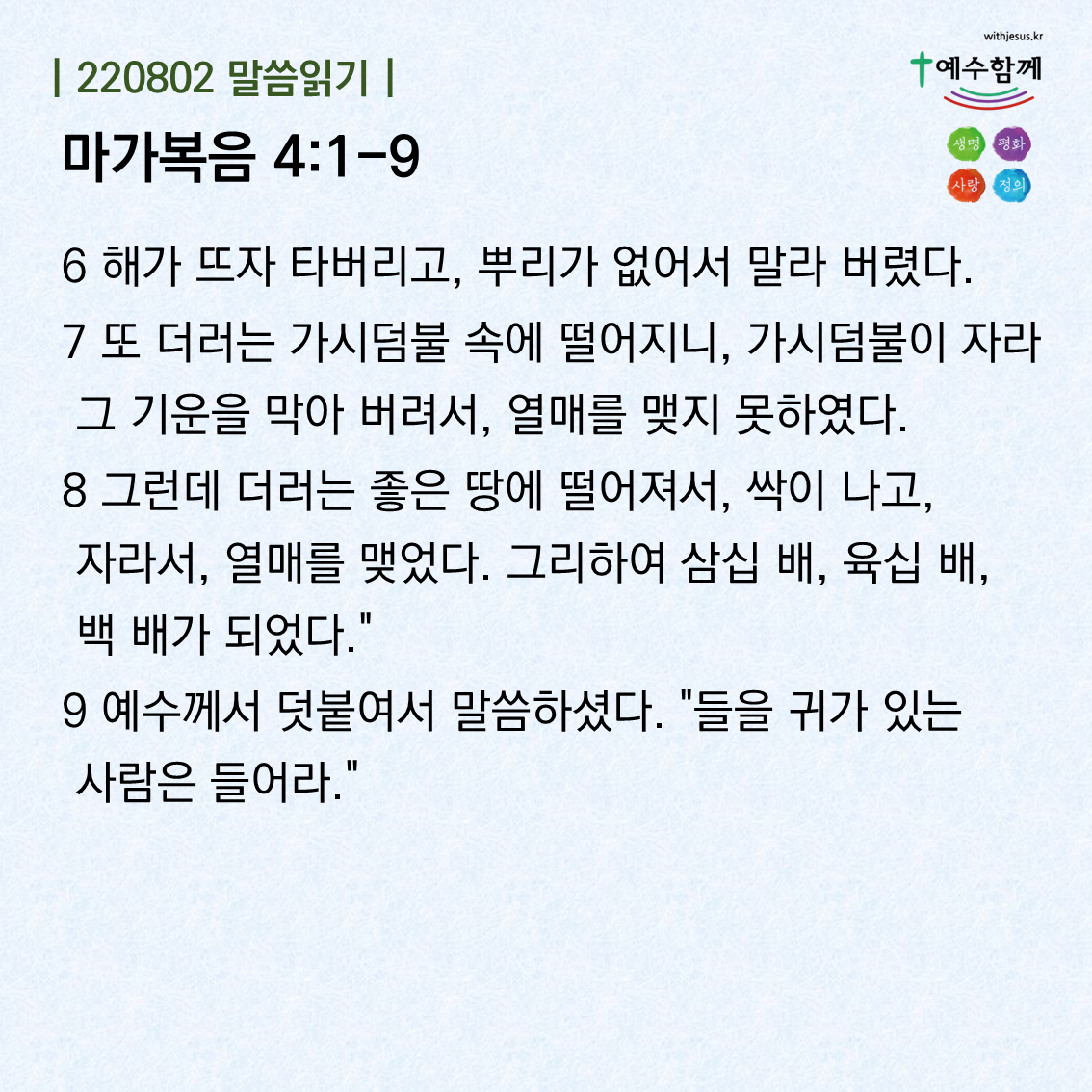 | [예수함께말씀 220804] 마가복음 4:13-20 (0) | 2022.08.03 |