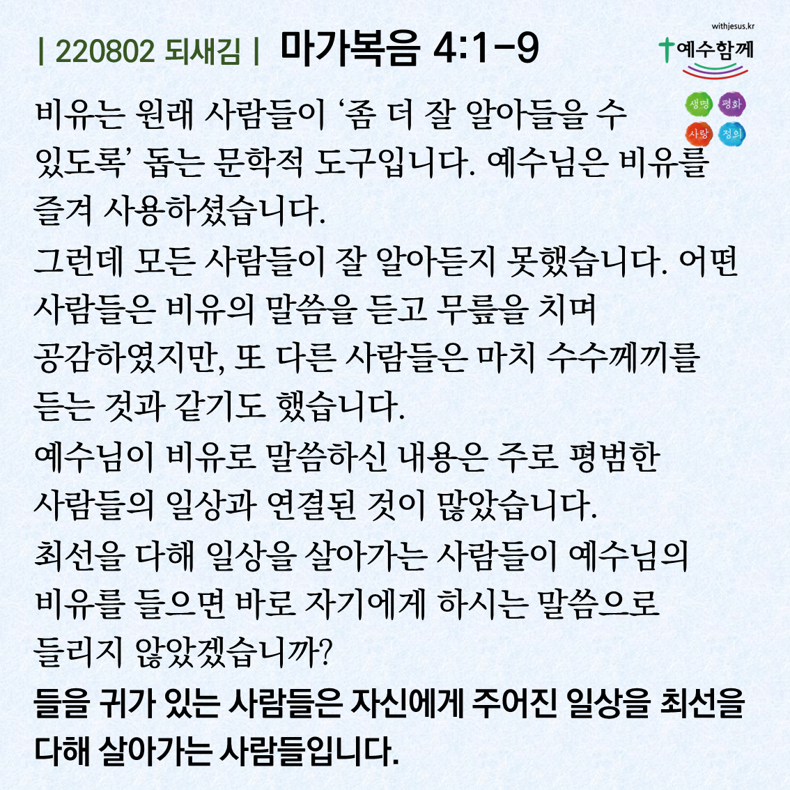 | [예수함께말씀 220804] 마가복음 4:13-20 (0) | 2022.08.03 |