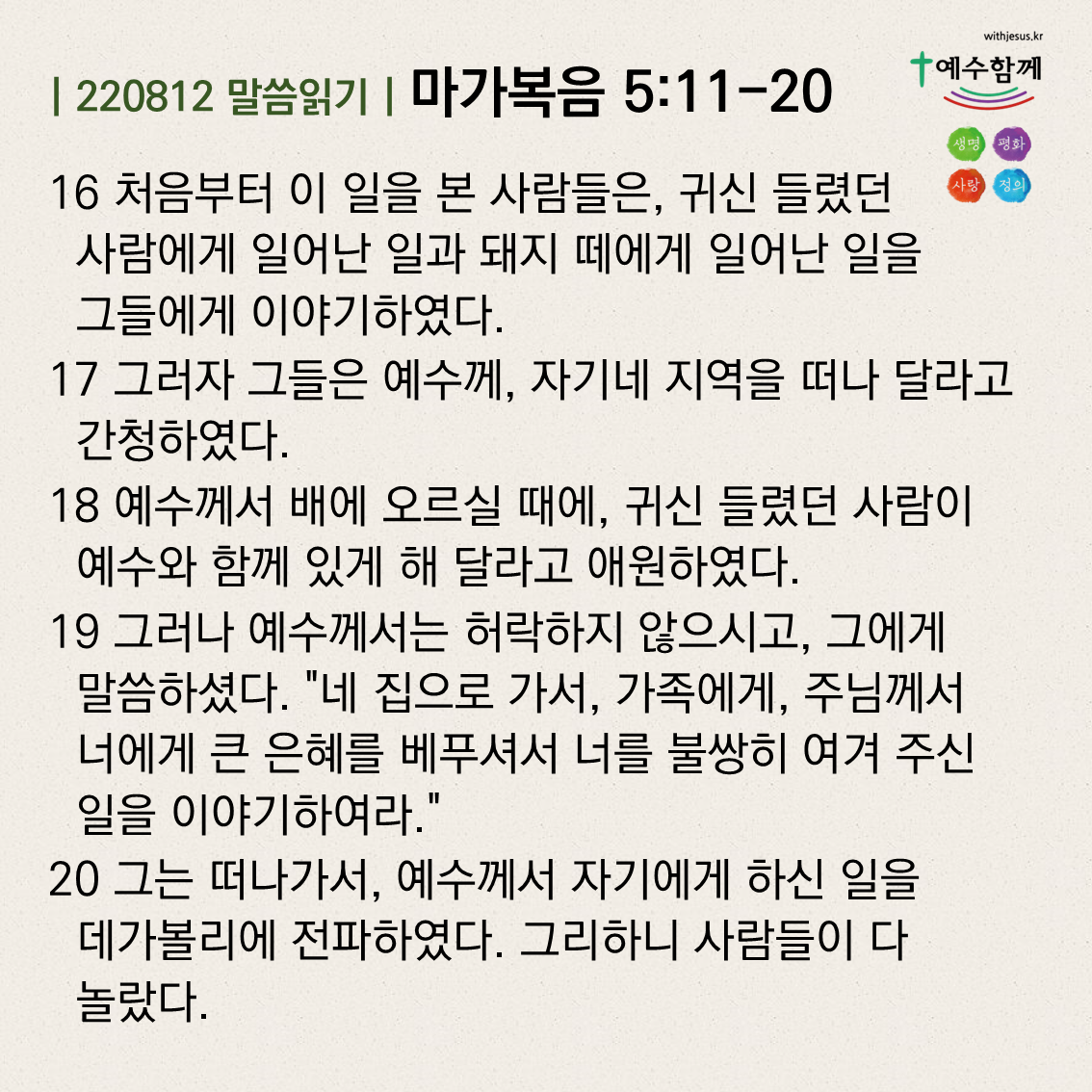 | [예수함께말씀 220822] 마가복음 5:21-24 (0) | 2022.08.21 |