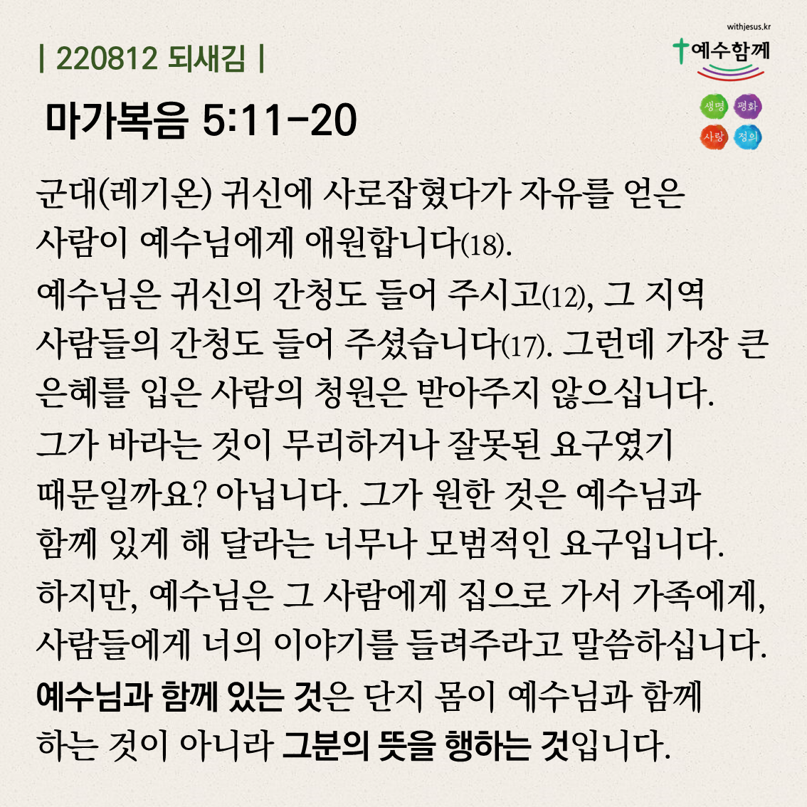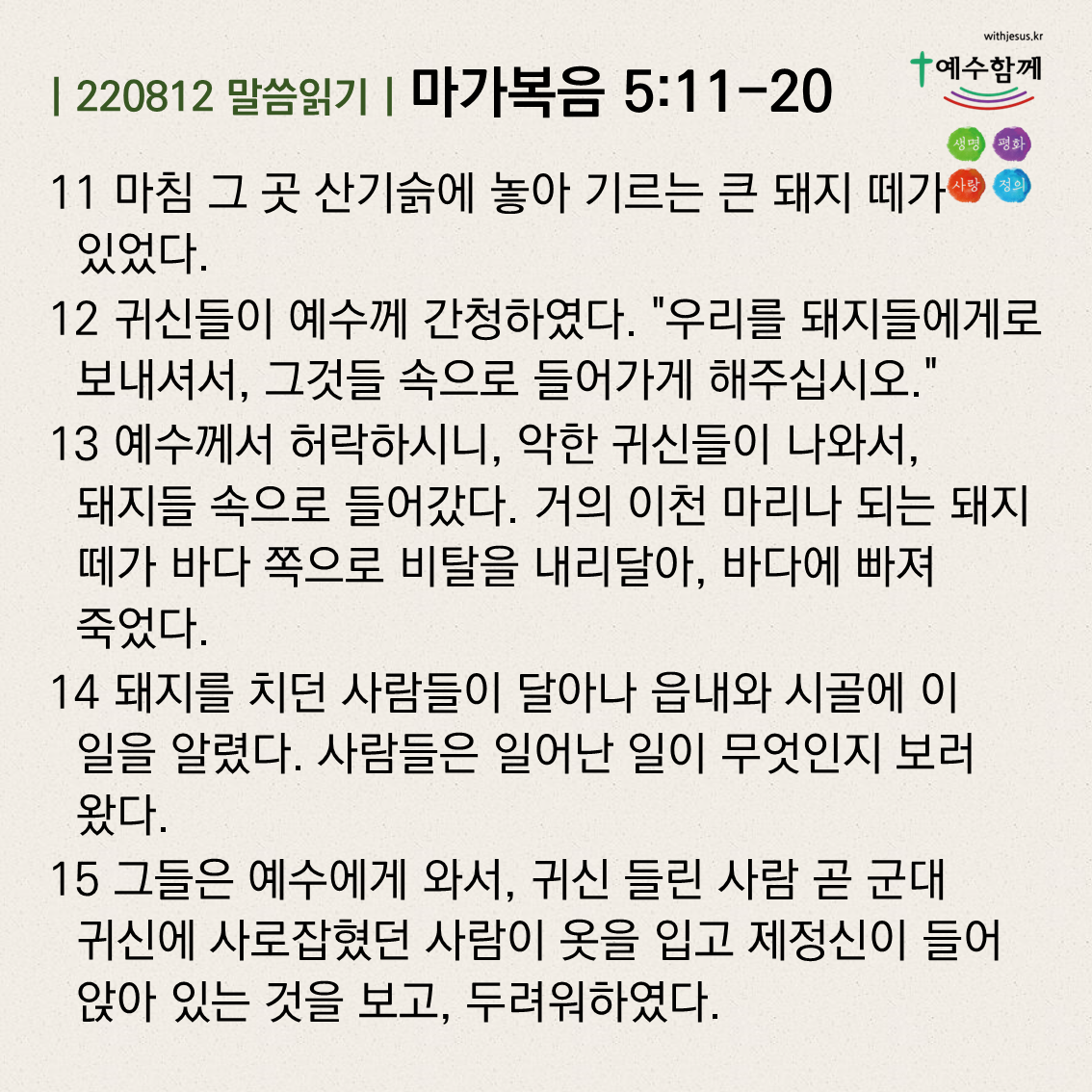 | [예수함께말씀 220822] 마가복음 5:21-24 (0) | 2022.08.21 |