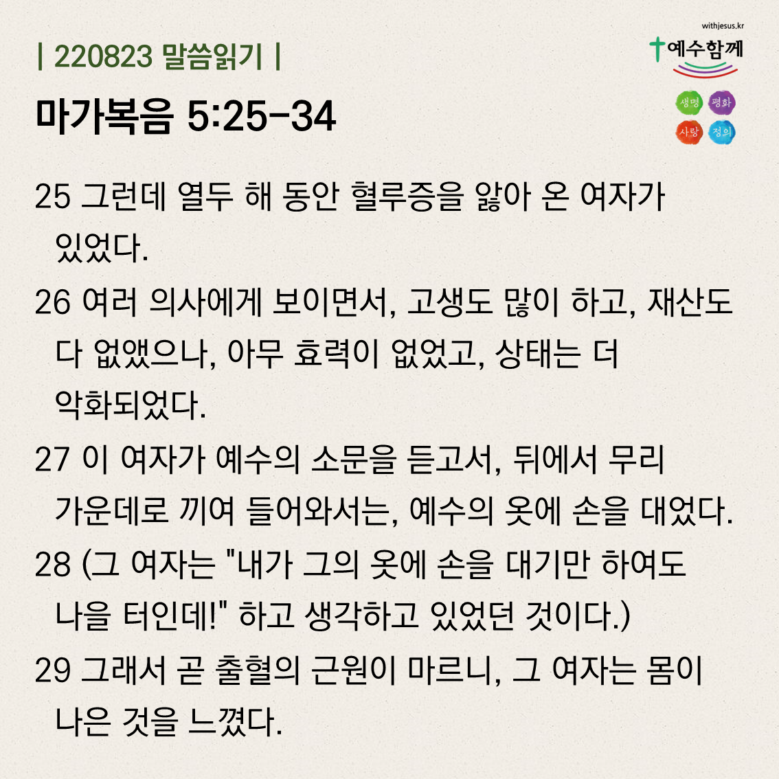 | [예수함께말씀 220822] 마가복음 5:21-24 (0) | 2022.08.21 |