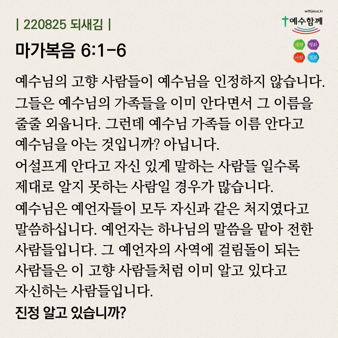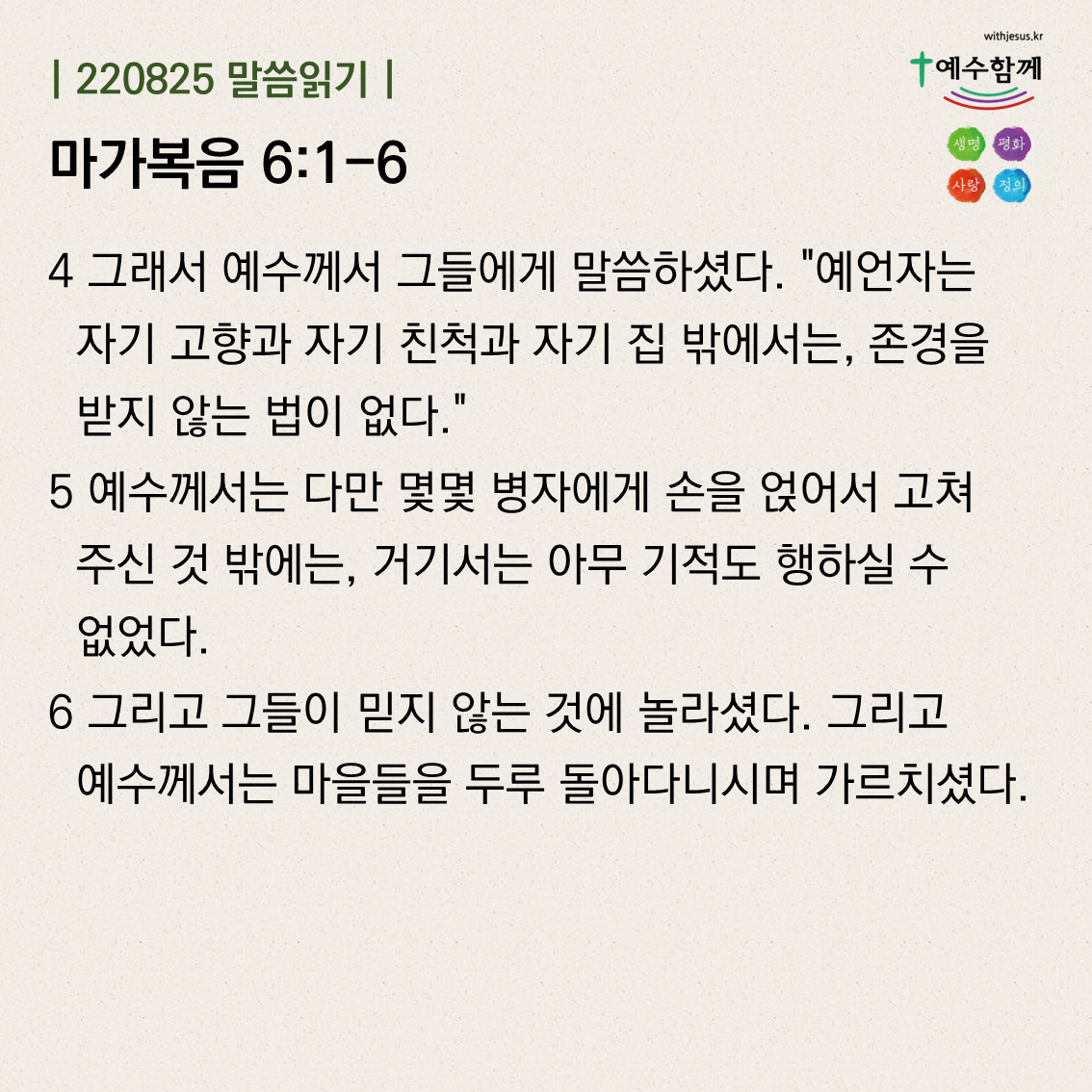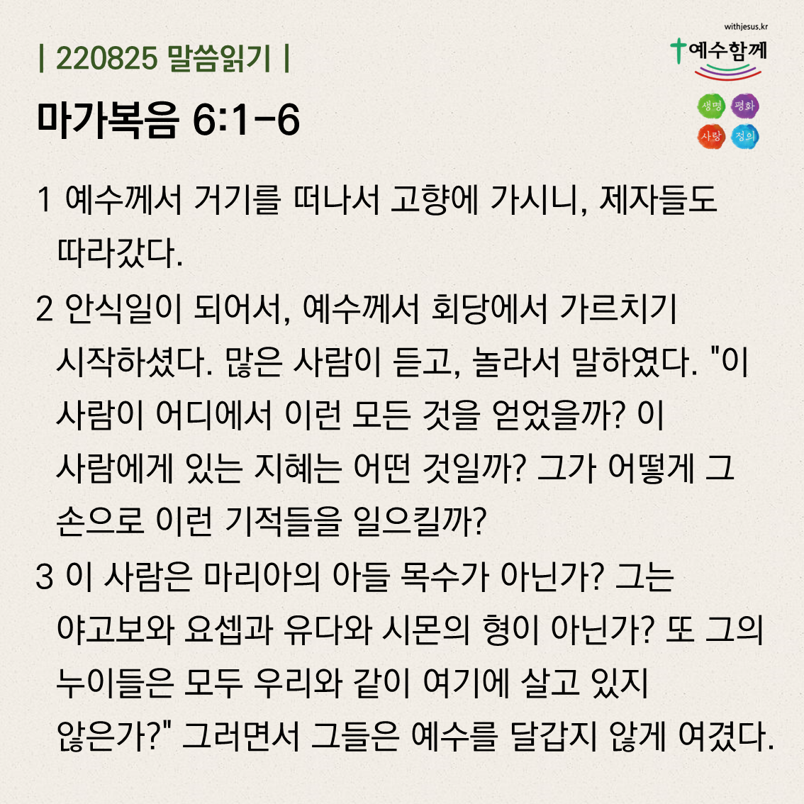 | [예수함께말씀 220826] 마가복음 6:7-13 (0) | 2022.08.25 |
