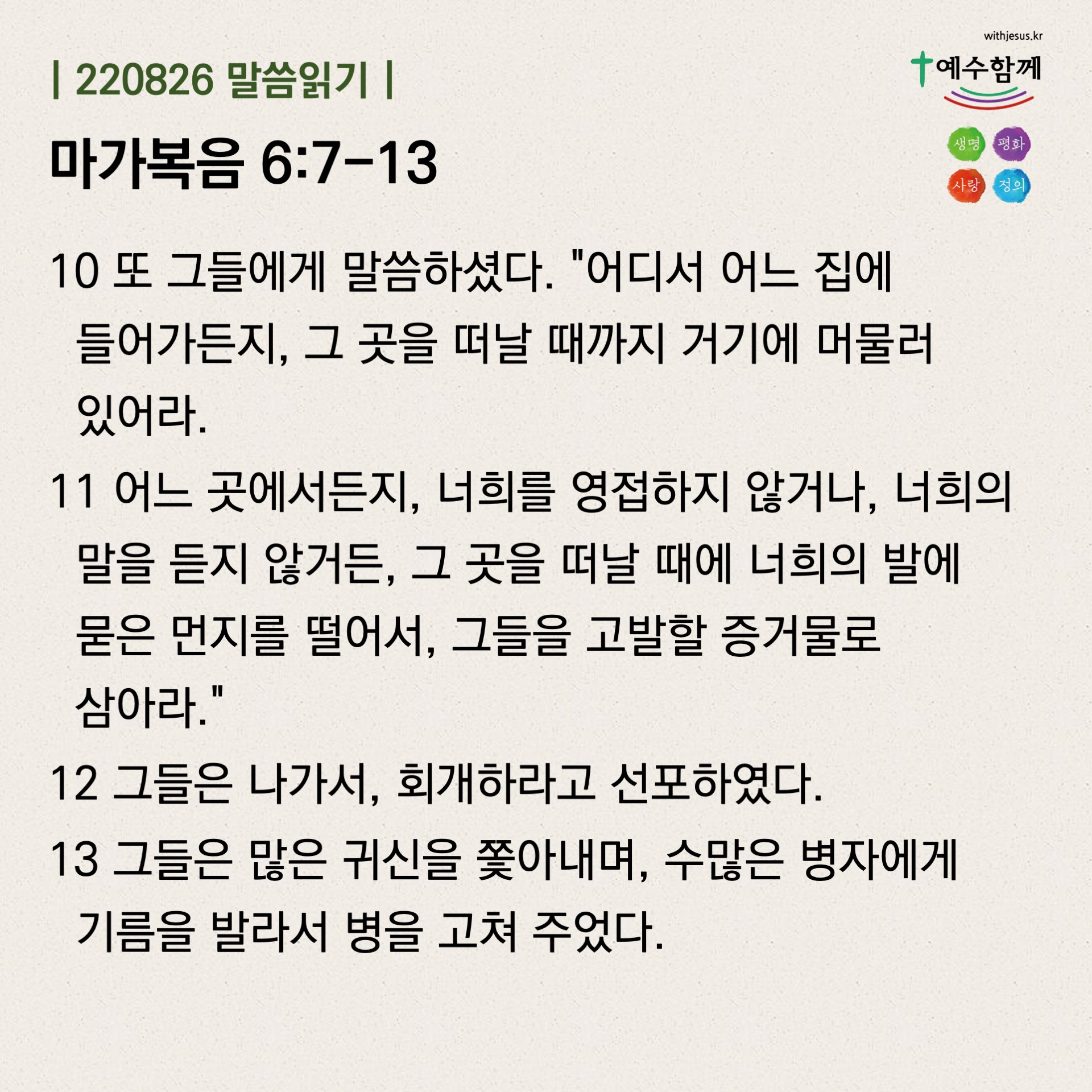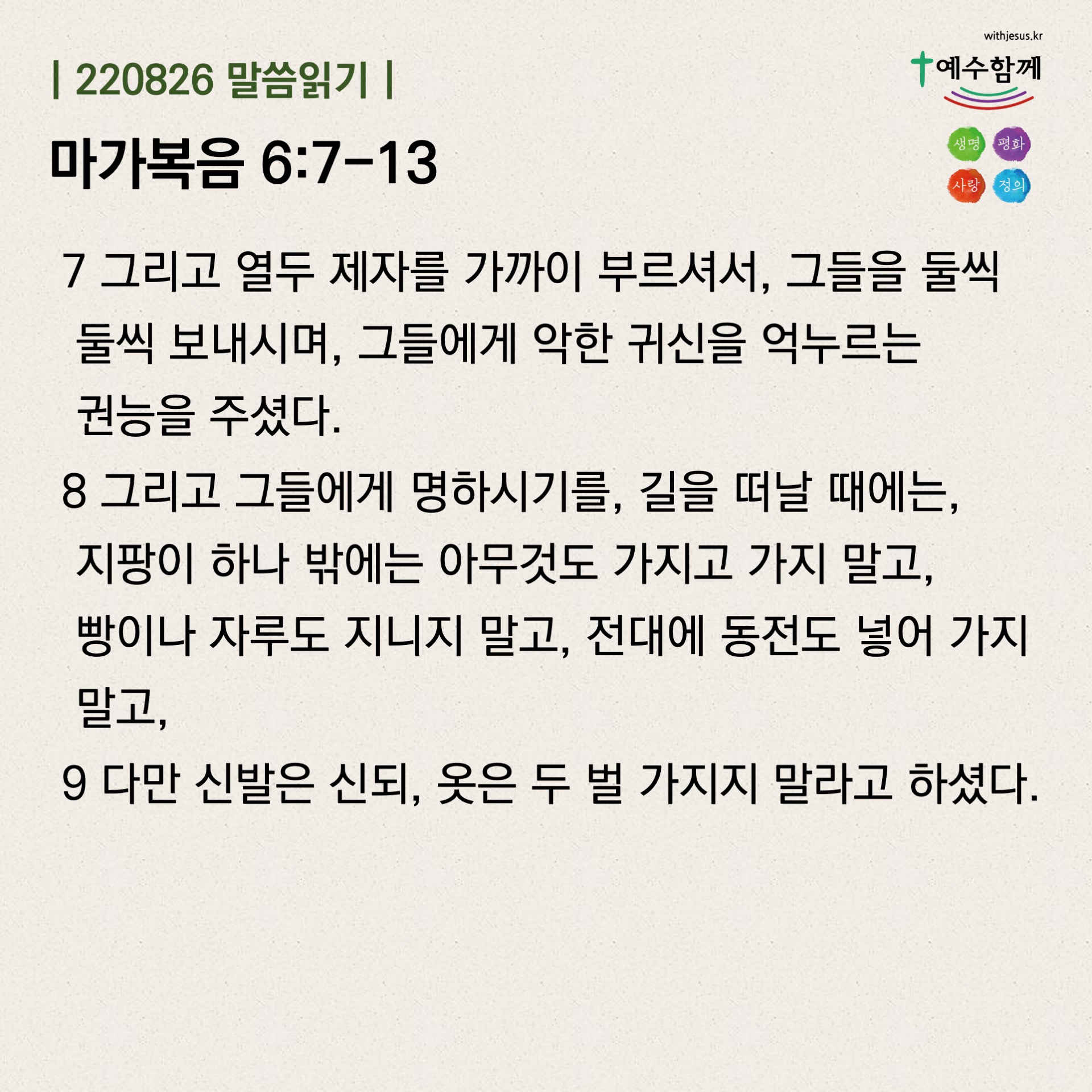 | [예수함께말씀 220825] 마가복음 6:1-6 (0) | 2022.08.24 |