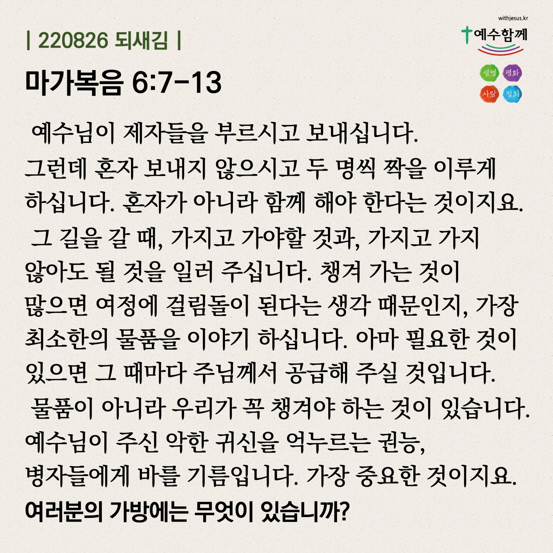 | [예수함께말씀 220825] 마가복음 6:1-6 (0) | 2022.08.24 |