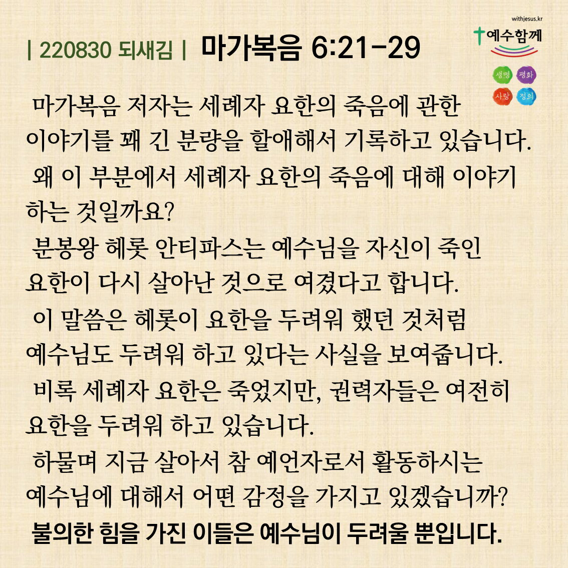 | [예수함께말씀 220826] 마가복음 6:7-13 (0) | 2022.08.25 |