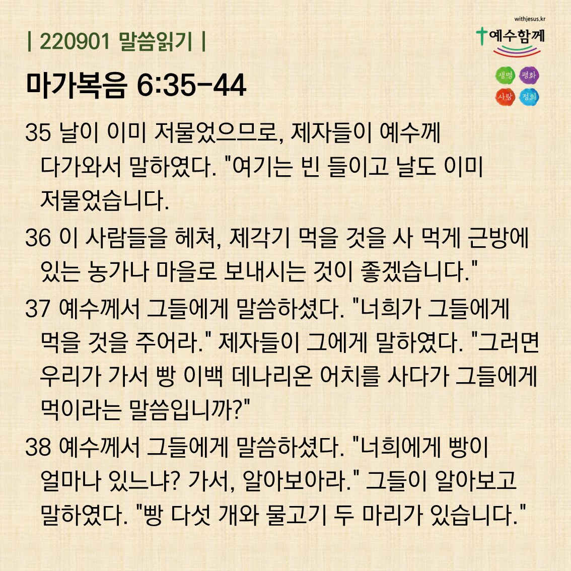 | [예수함께말씀 220912] 마가복음 6:45-52 (0) | 2022.09.11 |
