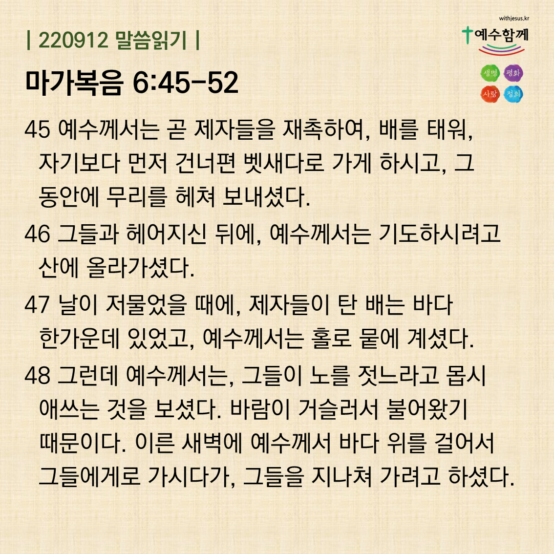 | [예수함께말씀 220901] 마가복음 6:35-44 (0) | 2022.08.31 |