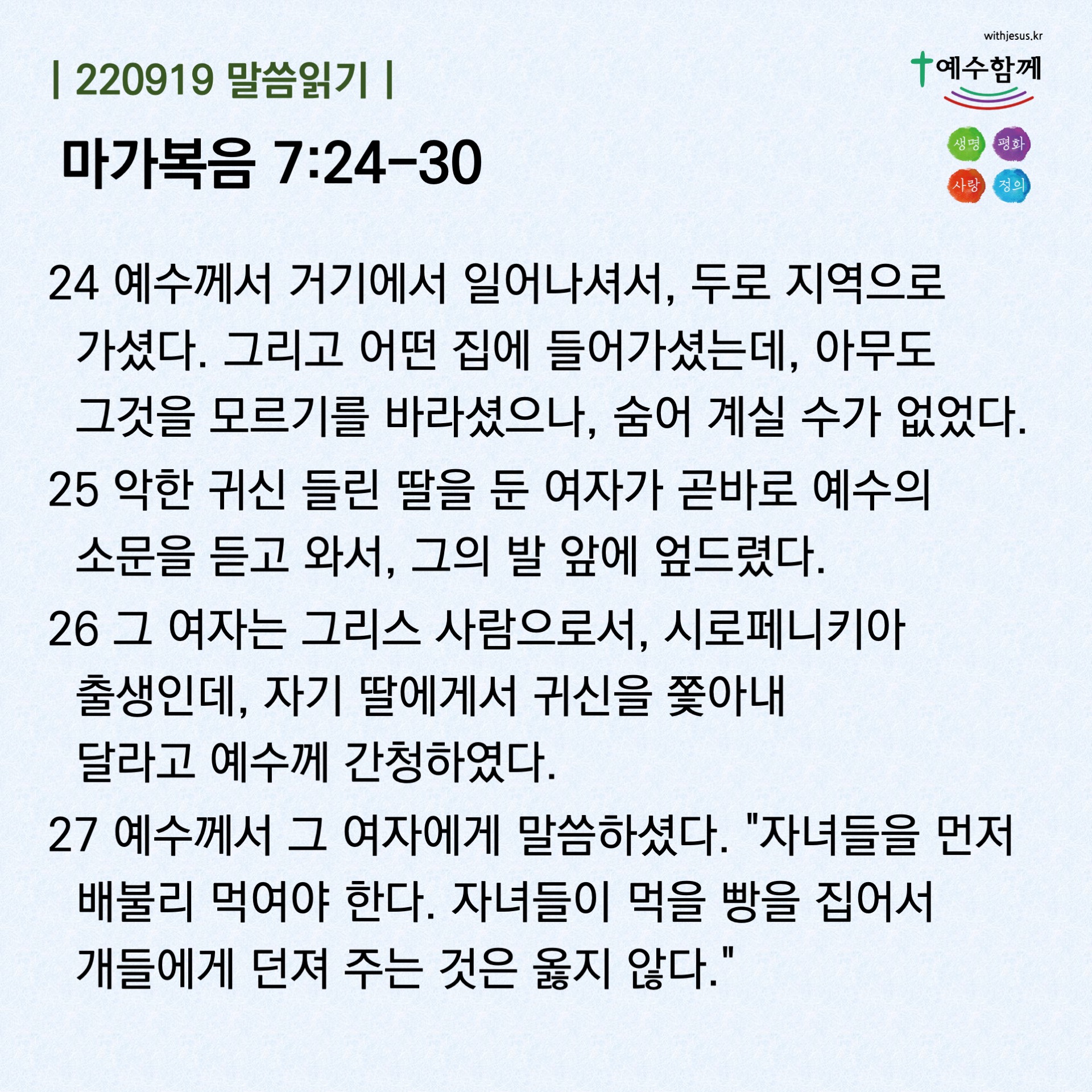 | [예수함께말씀 220916] 마가복음 7:14-23 (0) | 2022.09.16 |