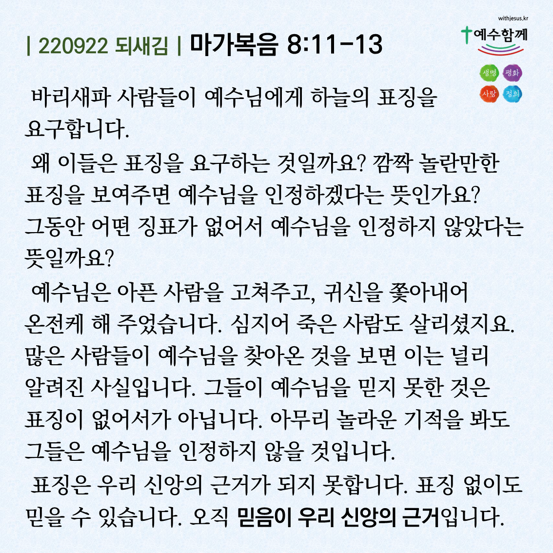 | [예수함께말씀 220919] 마가복음 7:24-30 (0) | 2022.09.18 |