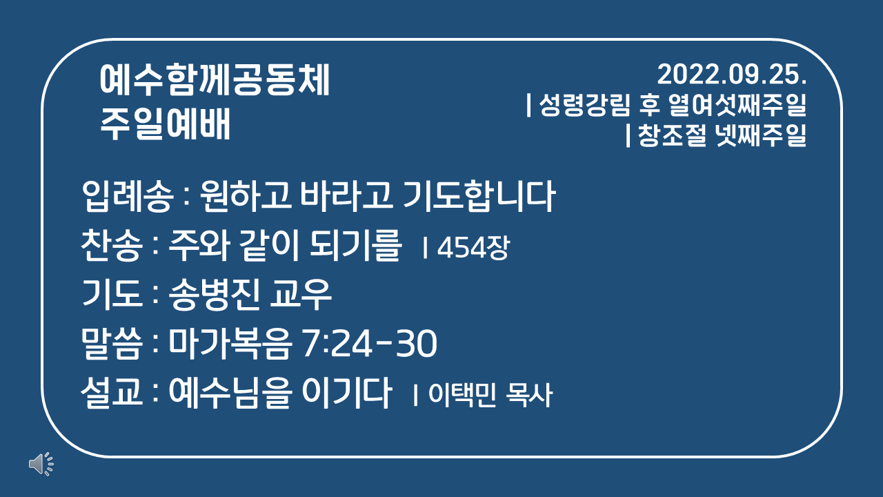 | 2022년 9월 25일 예수함께 주일예배 자료 (0) | 2022.09.24 |