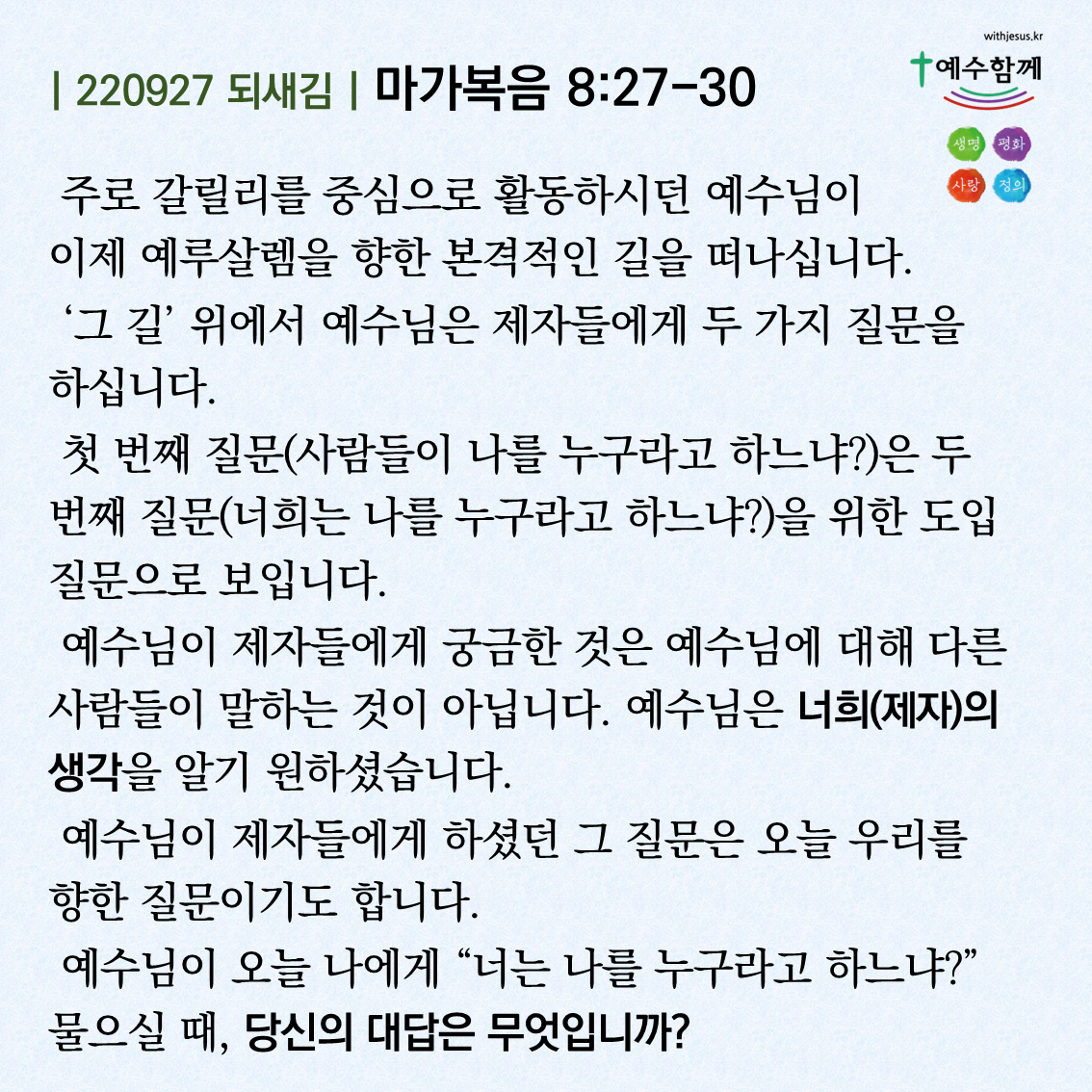 | [예수함께말씀 220928] 마가복음 8:31-9:1 (0) | 2022.09.27 |