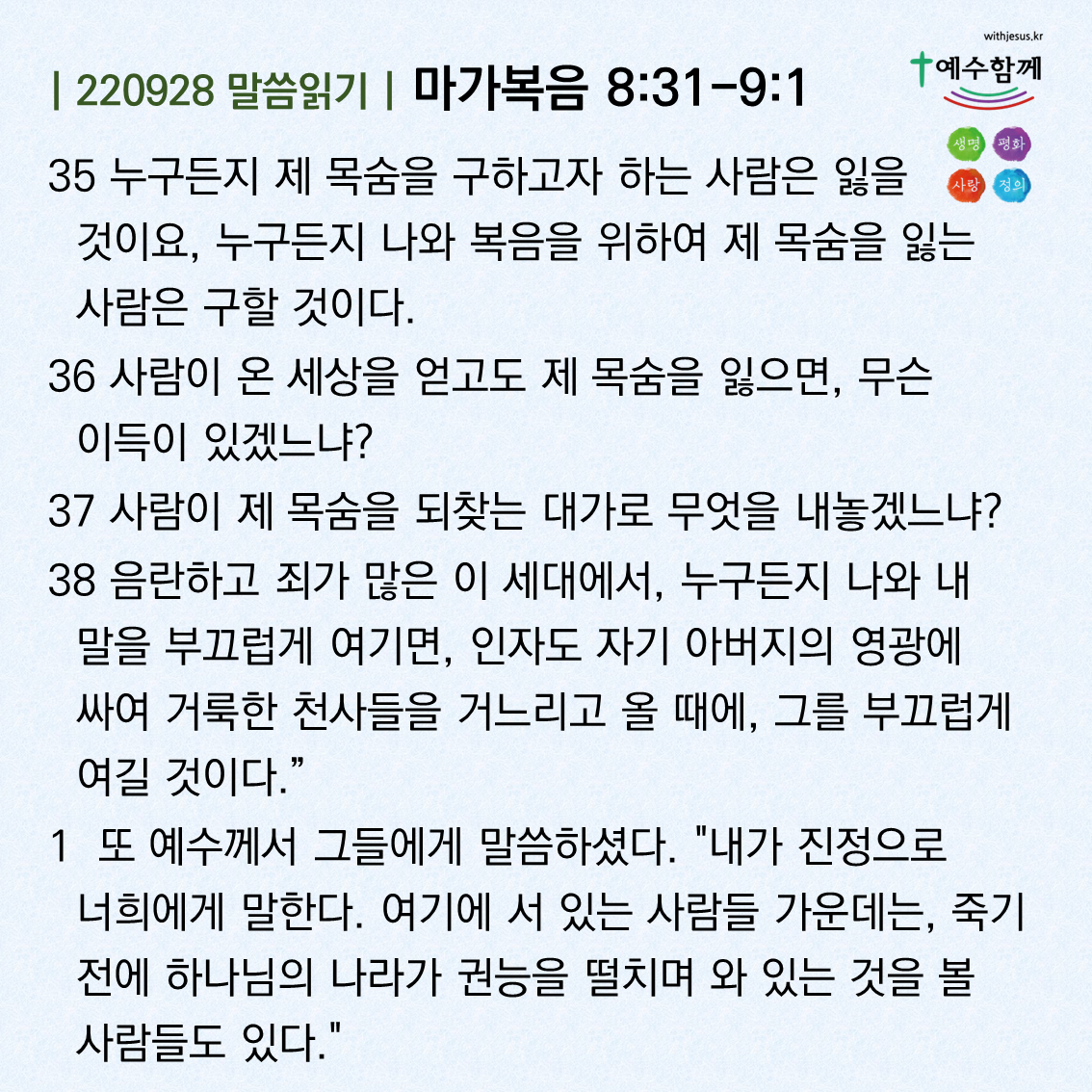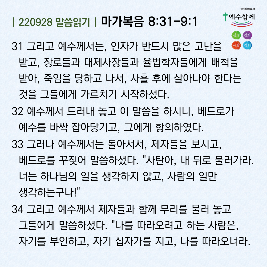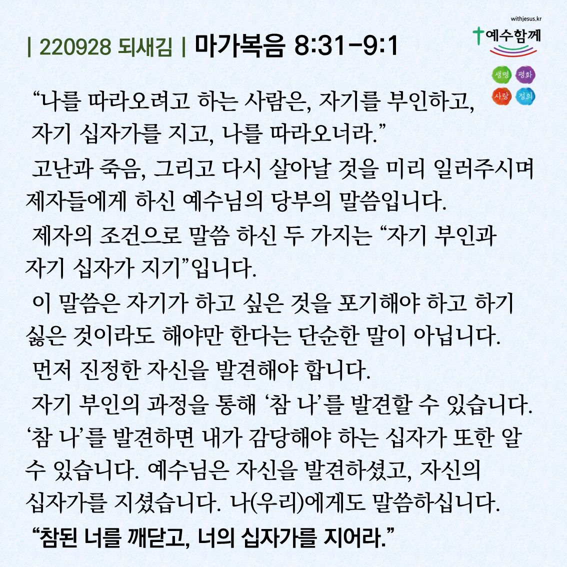 | [예수함께말씀 220927] 마가복음 8:27-30 (0) | 2022.09.26 |