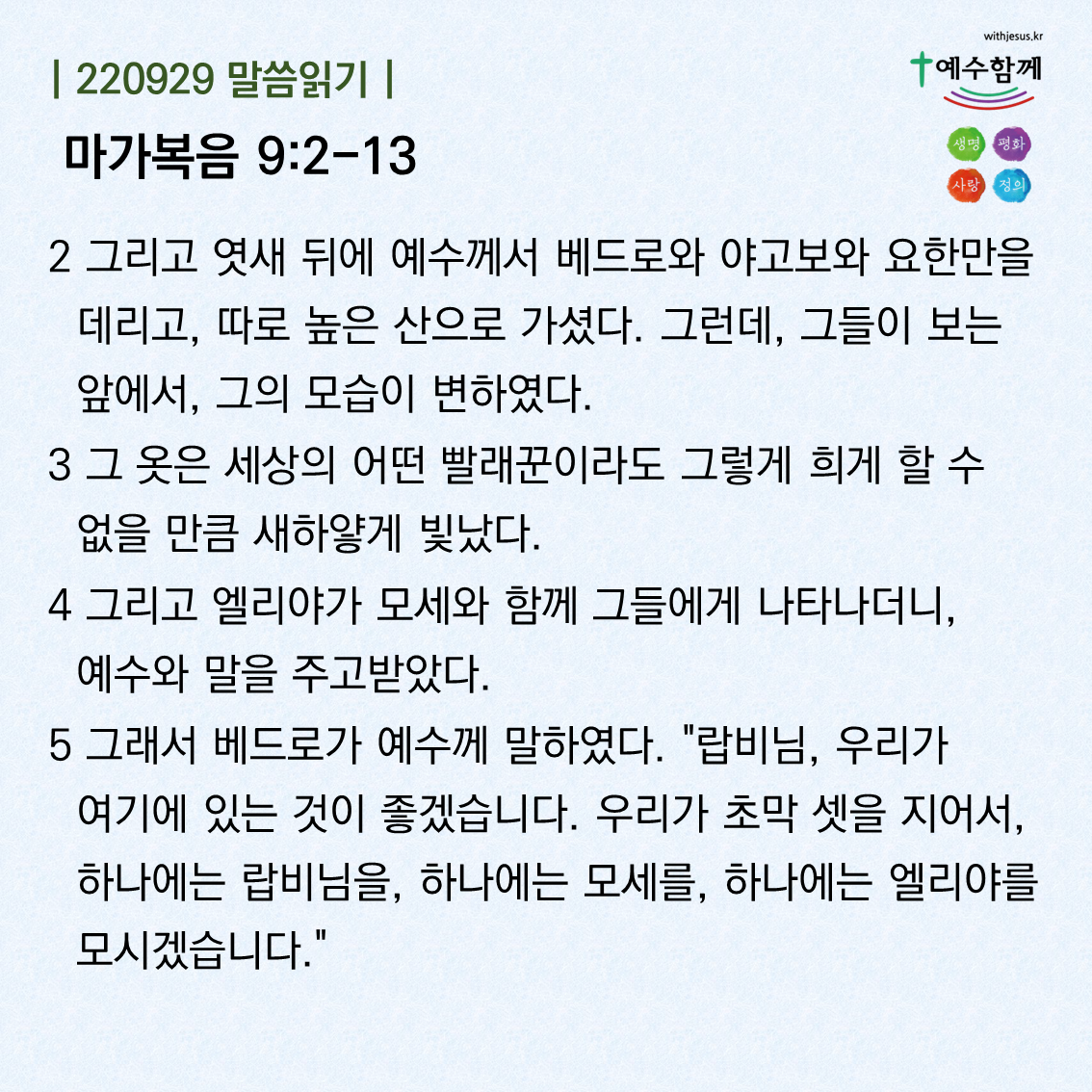 | [예수함께말씀 220930] 마가복음 9:14-19 (0) | 2022.09.29 |