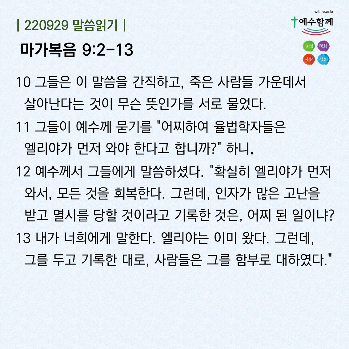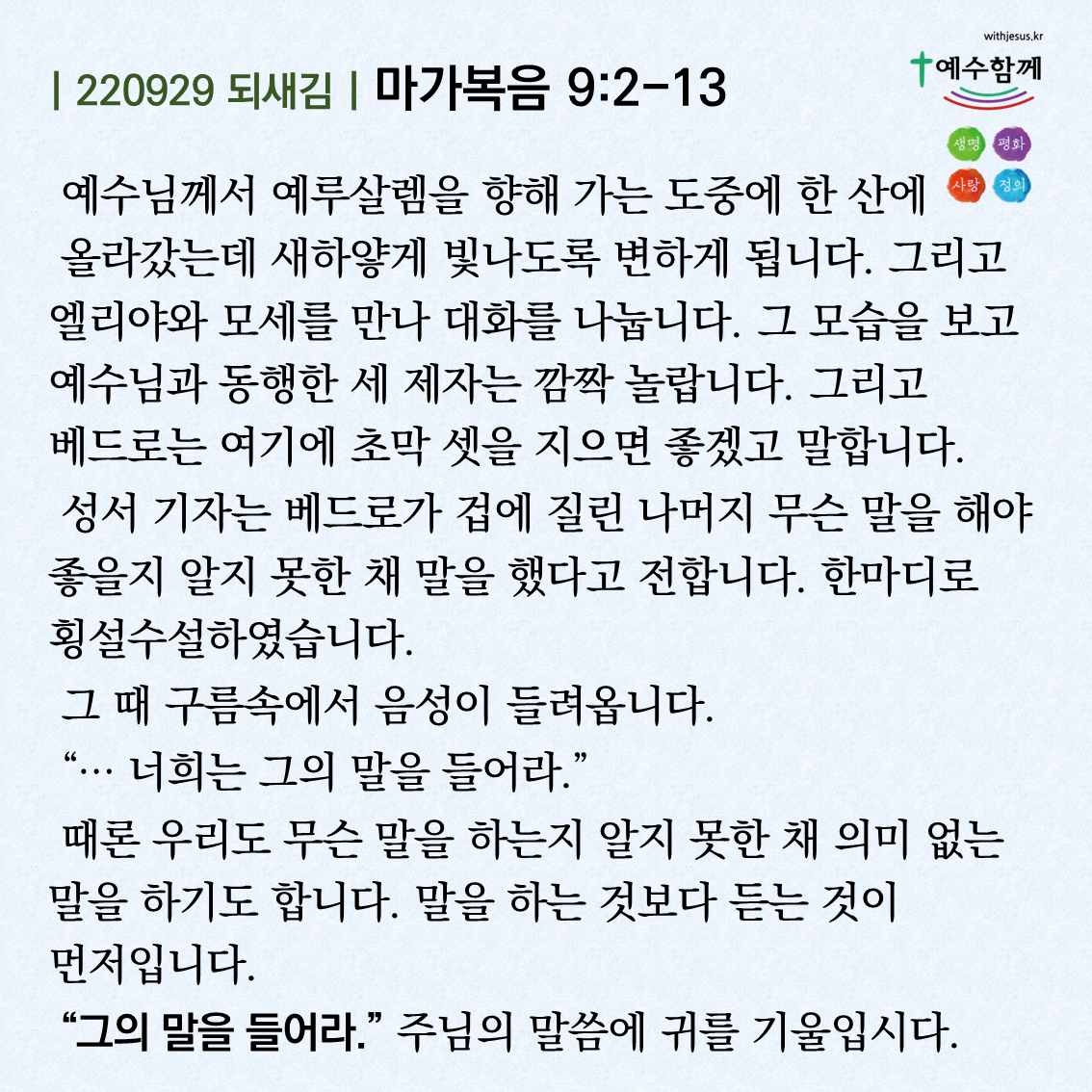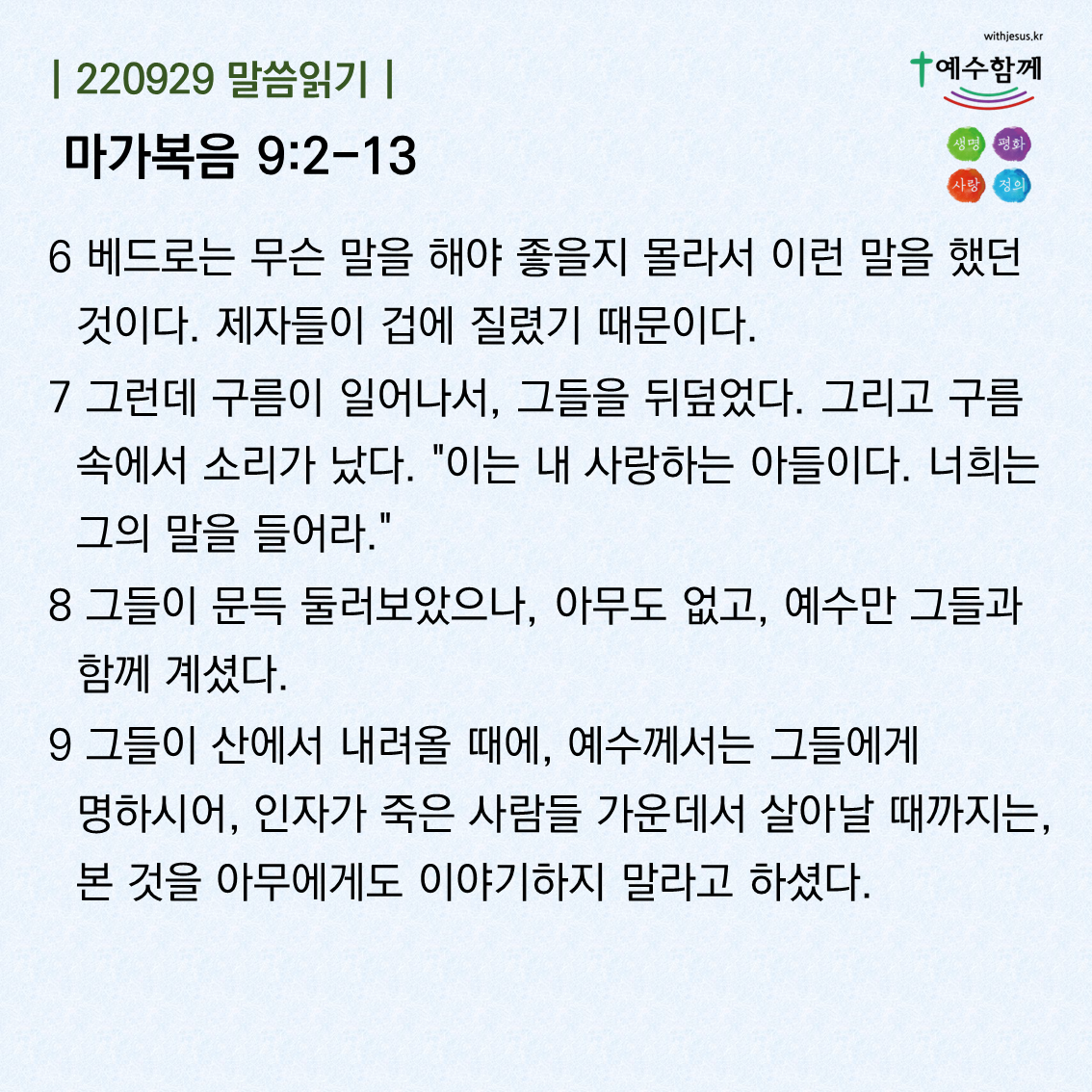 | [예수함께말씀 220930] 마가복음 9:14-19 (0) | 2022.09.29 |