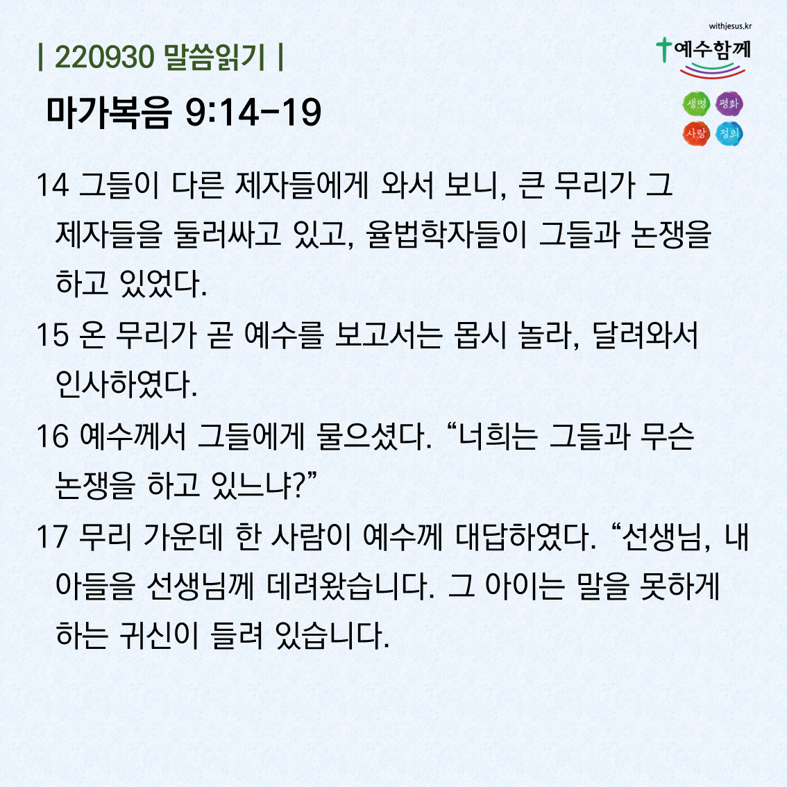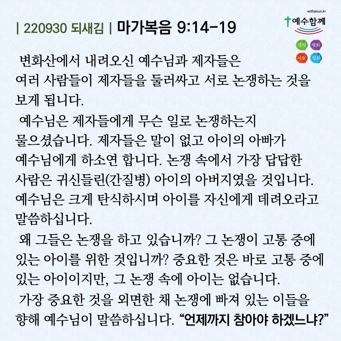 | [예수함께말씀 221003] 마가복음 9:20-29 (0) | 2022.10.02 |