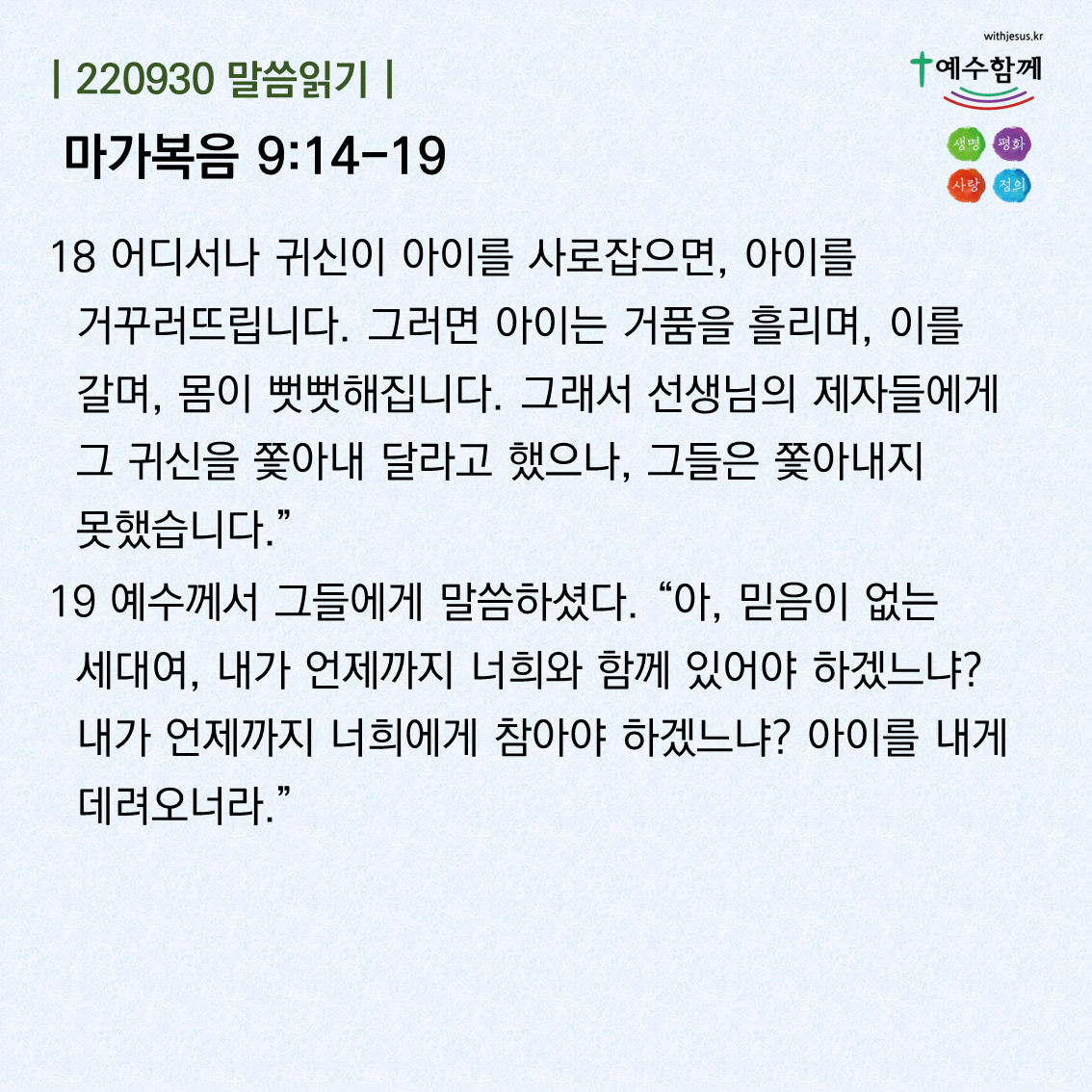 | [예수함께말씀 221004] 마가복음 9:30-32 (0) | 2022.10.03 |